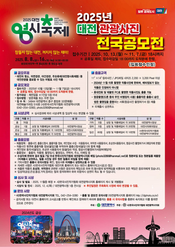 ■ 공모내용 대전의 명소, 자연경관, 야간경관, 주요축제(대전 0시 축제 등) 등 대전관광을 홍보할 수 있는 미발표 사진 작품 ■ 참가자격 제한 없음 ■ 출품수 1인당 5점 이내 ■ 참가방법 방문제출 또는 우편 접수 - 접수처 : 34944 대전광역시 중구 중앙로 32 (문화동) 대전예술가의집 516호 ㈔한국사진작가협회 대전광역시지회(042-254-3280) ■ 작품규격 11″×14″칼라사진 / JPG파일 사이즈 2,200 × 3,200 Pixel 이상 - 2024년 11월 이후 촬영한 작품사진에 한하며, 메타정보가 없는 작품은 인정하지 아니함 - 휴대전화 및 테블릿 PC로 촬영한 작품사진은 출품할 수 있음 - 항공촬영(드론 등의 무인 비행장치 사용) 출품작은 출품시 승인 받은 촬영임을 증명하는 서류(항공사진 촬영허가서 등) 제출 ※ 미제출시 상권취소 ■ 시상내역 금상 1점 : 상장 및 작품매입비 200만원 은상 2점 : 상장 및 작품매입비 각 100만원 동상 3점 : 상장 및 작품매입비 각 50만원 가작 5점 : 상장 및 작품매입비 각 30만원 장려 5점 : 상장 및 작품매입비 각 20만원 입선 60점 : 상장 및 작품매입비 각 10만원 ■ 결과발표 2025. 11월중 예정 |