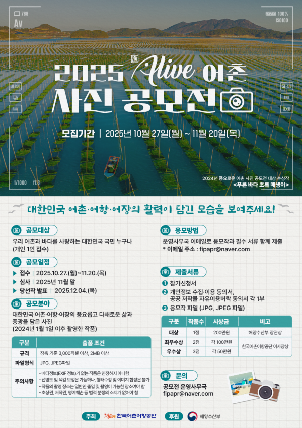 ■ 공모내용 대한민국 어촌·어항·어장의 풍요롭고 다채로운 삶과 풍광을 담은 사진 (2024년 1월 1일 이후 촬영한 작품) ■ 참가자격 우리 어촌과 바다를 사랑하는 대한민국 국민 누구나 ■ 출품수 1인당 최대 3개 작품 제한 ■ 참가방법 운영사무국 이메일로 응모작과 필수 서류 함께 제출 * 이메일 주소 : fipapr@naver.com 제출서류 : 참가신청서, 개인정보 수집·이용 동의서, 공공저작물 자유이용허락 동의서 각 1부, 응모작 파일 (JPG, JPEG 파일) ■ 작품규격 규격 : 장축 기준 3,000픽셀 이상, 2MB 이상 파일형식 : JPG, JPEG파일 주의사항 - 메타정보(EXIF 정보)기 없는 작품은 인정하지 아니함 - 선명도 및 색감 보정은 가능하나, 형태수정 및 이미지 합성은 불가 - 작품의 촬영 장소는 일반인 출입 및 촬영이 가능한 장소여야 함 - 초상권, 저작권, 명예훼손 등 법적 분쟁의 소지가 없어야 함 ■ 시상내역 대상 1점 : 200만원 최우수상 2점 : 각 100만원 우수상 3점 : 각 50만원 ■ 결과발표 2025.12.04.(목) |