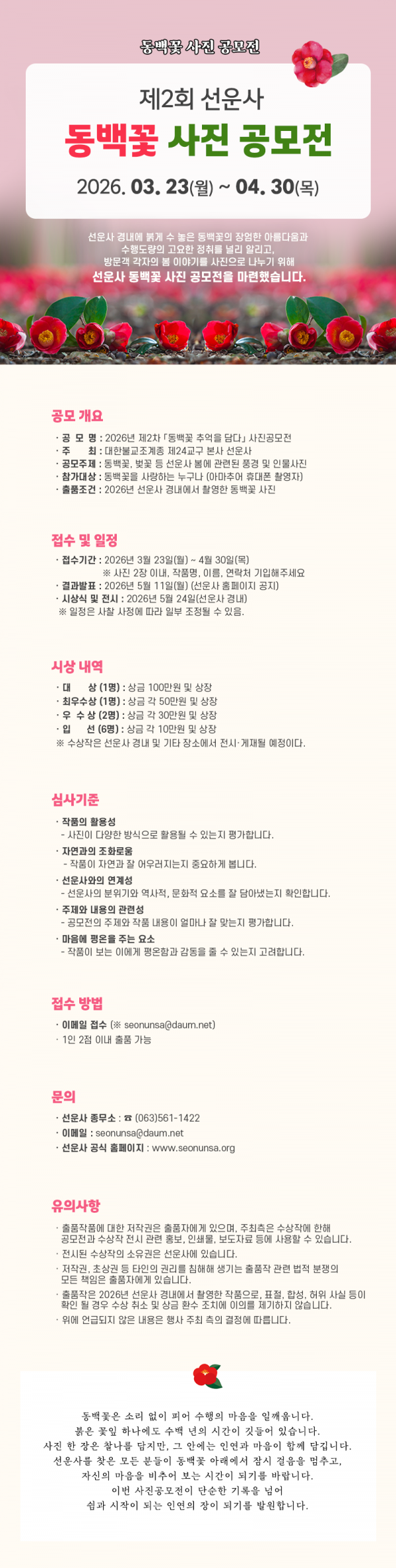 ■ 공모내용 동백꽃, 벚꽃 등 선운사 일대 관련된 풍경 및 인물사진 ■ 참가자격 동백꽃을 사랑하는 누구나 (아마추어 휴대폰 촬영자) ■ 출품수 1인 2점 이내 출품 가능 ■ 참가방법 이메일 접수: seonunsa@daum.net ※ 사진 2장 이내, 작품명, 이름, 연락처 기입해주세요. ■ 작품규격 2026년 선운사 경내에서 촬영한 동백꽃 사진 ■ 시상내역 대상(1명): 상금 100만원 및 상장 최우수상(1명): 상금 각 50만원 및 상장 우수상(2명): 상금 각 30만원 및 상장 입선(8명): 상금 각 10만원 및 상장 ■ 결과발표 2026년 5월 11일(월) (선운사 홈페이지 공지) ■ 유의사항 - 출품작품에 대한 저작권은 출품자에게 있으며, 주최측은 수상작에 한해 공모전과 수상작 전시 관련 홍보, 인쇄물, 보도자료 등에 사용할 수 있습니다. - 전시된 수상작의 소유권은 선운사에 있습니다. - 저작권, 초상권 등 타인의 권리를 침해해 생기는 출품작 관련 법적 분쟁의 모든 책임은 출품자에게 있습니다. - 출품작은 2026년 선운사 경내에서 촬영한 작품으로, 표절, 합성, 허위 사실 등이 확인될 경우 수상 취소 및 상금 환수 조치에 이의를 제기하지 않습니다. - 위에 언급되지 않은 내용은 행사 주최 측의 결정에 따릅니다. |