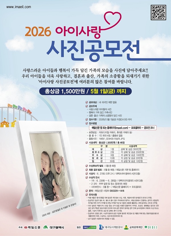 ■ 공모내용 사랑스러운 아이들의 사진 행복이 가득 담긴 가족사진 결혼·출산·가족의 소중함이 담긴 사진 ■ 참가자격 내·외국인 제한 없음 ■ 출품수 1인 최대 4점 ■ 참가방법 공모전 홈페이지를 통한 직접 접수 ■ 작품규격 1MB(1,024KB) 이상의 JPG ■ 시상내역 대상 1점 : 300만원 최우수상 2점 : 각 200만원 우수상 3점 : 각 100만원 장려상 10점 : 각 20만원 입선 30점 : 각 10만원 ■ 결과발표 5월 중 예정 / 매일신문 지면 및 홈페이지 ■ 유의사항 - 작품 제출은 행사진행을 위해 필요한 개인정보 수집, 이용, 제공에 대한 동의를 한 것으로 간주함 - 입상작은 입상작 발표 후, 별도의 통지 없이 주최측(대구광역시, 매일신문)에서 진행하는 공익적 사업(공익 목적을 위한 2차적 저작물 및 편집 저작물 작성 및 이용권 포함)에 활용하는 것에 동의하는 것으로 간주함 - 이미 발표된 작품이거나 표절·합성·조작 등을 비롯한 출품작의 저작권, 초상권, 명예훼손 등으로 인한 모든 법적 책임은 응모자에게 있으며 이와 같은 문제가 밝혀질 경우 전체 심사과정에서 제외와 수상 취소는 물론, 시상식 이후라도 상금 및 상패는 환수 조치됨 - 입상자로 선정된 경우, 수상작 발표와 상금 지급에 필요한 개인정보 및 제출규격에 맞는 원본파일을 별도로 제출하여야 하며, 수상자는 시상식에 참여하여야 함 - 상기 일정은 사정에 따라 변경될 수 있음 |