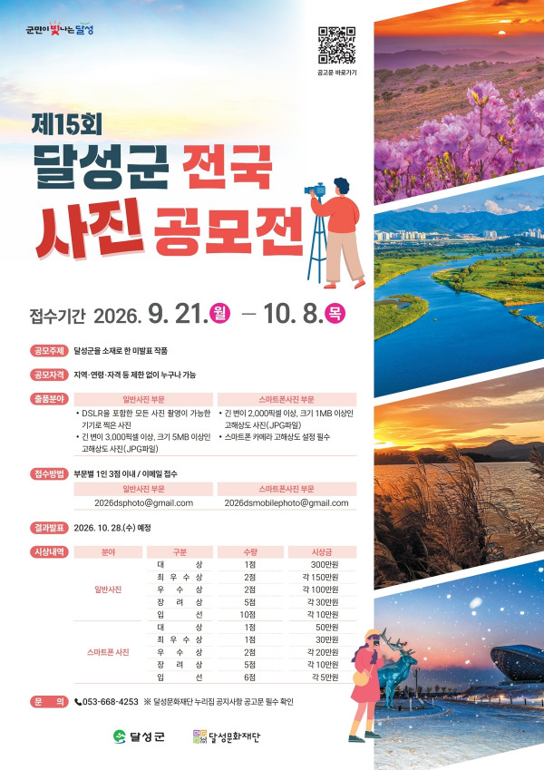 ■ 공모내용 관광자원 및 자연환경: 달성군 수려한 자연경관과 주요 관광명소를 생생하게 담아낸 작품 - 예) 비슬산, 강정보 디아크, 송해공원, 사문진 나루터 등 축제 및 문화행사 : 지역 축제와 역동적인 문화행사의 현장감 및 생동감 넘치는 순간을 담아낸 작품 - 예) 비슬산 참꽃문화제, YES! 키즈존, 달성 100대 피아노, 달성 대구현대미술제 등 역사자원 및 전통문화 : 유구한 역사를 간직한 국가유산과 전통문화 속에 깃든 고유의 정취를 담아낸 작품 - 예) 하목정, 도동서원, 남평문씨본리세거지, 육신사 등 지역민 생활상 : 지역민의 정겨운 일상과 지역 고유의 삶의 모습을 담아낸 작품 - ex) 상인들의 삶의 모습, 농경 생활, 도시·마을 풍경 등 기타 : 지역의 숨은 명소나 지역의 미래 가치를 담은 참신하고 홍보 효과가 높은 작품 ※ 최근 3년간(2023년~2025년) 수상작들과 유사한 촬영구도는 지양 ■ 참가자격 제한 없음 (전국 누구나 참여 가능) ■ 출품수 부문별 1인 3점 이내 (미발표 작에 한함) ■ 참가방법 일반사진 부문 이메일: 2026dsphoto@gmail.com 스마트폰사진 부문 이메일: 2026dsmobilephoto@gmail.com 이메일 제목 `달성군전국사진공모전_(일반/스마트폰)_본인 이름`으로 접수 ex)달성군전국사진공모전_일반_홍길동 ■ 작품규격 일반사진 부문 - DSLR을 포함한 모든 사진 촬영이 가능한 기기로 찍은 사진 - JPG파일(RGB모드)로 긴 변이 3,000픽셀 이상, 크기 5MB 이상인 고해상도 사진 ※ 원본 정보(EXIF)가 없는 작품은 인정하지 않음 (촬영일, 촬영지 위도, 경도, 고도, 시간 등의 정보 확인가능할 것) 스마트폰사진 부문 - JPG파일(RGB모드)로 긴 변이 2,000픽셀 이상, 크기 1MB 이상인 고해상도 사진 - 스마트폰 카메라 고해상도 설정 필수 ※ 원본 정보(EXIF)가 없는 작품은 인정하지 않음 (촬영일, 촬영지 위도, 경도, 고도, 시간 등의 정보 확인가능할 것) ■ 시상내역 일반사진 대상 1점 : 300만원 최우수상 2점 : 각 150만원 우수상 2점 : 각 100만원 장려상 5점 : 각 30만원 입선 10점 : 각 10만원 스마트폰사진 대상 1점 : 50만원 최우수상 1점 : 30만원 우수상 2점 : 각 20만원 장려상 5점 : 각 10만원 입선 6점 : 각 5만원 ■ 결과발표 2026.10.28(수) 예정 |