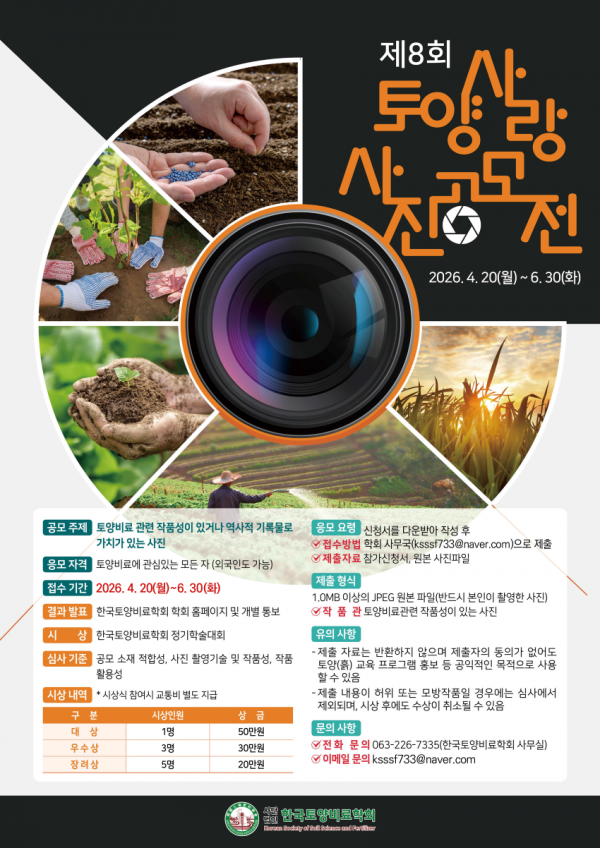 ■ 공모내용 토양비료 관련 작품성이 있거나 역사적 기록물로 가치가 있는 사진 ■ 참가자격 토양비료에 관심있는 모든 자 (외국인도 가능) ■ 참가방법 신청서를 다운받아 작성 후 접수방법 학회 사무국( ksssf733@naver.com )으로 제출 제출자료 : 참가신청서, 원본 사진파일 ■ 작품규격 1.0MB 이상의 JPEG 원본 파일(반드시 본인이 촬영한 사진) 작품관 토양비료관련 작품성이 있는 사진 ■ 시상내역 대상 1점 : 50만원 우수상 3점 : 각 30만원 장려상 5점 : 각 20만원 ■ 결과발표 한국토양비료학회 학회 홈페이지 및 개별 통보 ■ 유의사항 - 제출 자료는 반환하지 않으며 제출자의 동의가 없어도 토양(흙) 교육 프로그램 홍보 등 공익적인 목적으로 사용할 수 있음 - 제출 내용이 허위 또는 모방작품일 경우에는 심사에서 제외되며, 시상 후에도 수상이 취소될 수 있음 |