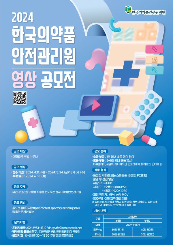 ■ 공모내용 국민의 안전한 의약품 사용을 선도하는 한국의약품안전관리원 ■ 공모부문 숏폼 부문 : 1분 이내 숏폼 형식 영상 롱폼 부문 : 2~5분이내 홍보 영상 ■ 참가자격 대한민국 국민 누구나 ■ 출품수 1인 2점 이내 출품 가능 ■ 참가방법 2024년 한국의약품안전관리원 영상 공모전 홈페이지를 통해 작품 접수 * 팀으로 참여 가능하나, 접수 시 대표자 1인만 가능 ■ 작품규격 - 동영상 카메라 또는 스마트폰(태블릿 PC 포함) 촬영 후 편집 영상 - 해상도: Full HD - 숏폼: 1080*1920 / 롱폼: 1920*1080 - 파일 확장자: MP4, AVI, MOV - 500MB 이하 압축 파일 제출 - 다큐멘터리, 극영화, 애니메이션, 인포그래픽, 브이로그, 인터뷰 등 자유 ■ 시상내역 대상 1점 : 200만원 숏폼부문 최우수상 1점 : 60만원 우수상 2점 : 각 30만원 롱폼부문 최우수상 1점 : 60만원 우수상 2점 : 각 30만원 ※ 대상은 숏폼, 롱폼 통합 시상입니다 ■ 결과발표 2024. 6. 18. (화) (예정) 공모전 홈페이지 확인 ■ 유의사항 - 관련 공모전, 국내‧외 타 공모전 등에서 입상한 응모작(본인 작품 포함) 및 타인의 작품을 표절하였을 경우, 심사 결과는 무효화되며 법적인 책임은 신청자에게 있음 - 응모작은 반드시 본인의 창작물이어야 하며, 저작권 침해가 우려될 시 심사에서 제외하고, 수상 이후라도 위반 사실이 밝혀졌을 경우에는 수상을 취소하고 상장 및 상금 등을 일체 회수함 - 응모자는 응모작이 제3자의 저작재산권을 침해하지 않도록 주의의무를 다하여야 함 ※ 폰트, 이미지 등 라이선스 확인 권장 - 선정작에 대한 저작권(저작인격권, 저작재산권)은 응모자에게 있으며, 공모전에서 선정한 작품에 대하여 한국의약품안전관리원은 시상과 동시에 해당 작품의 공개 및 홍보물 제작·전시·배포·인쇄 등 사용할 권리를 가지게 되며, 선정작의 저작재산권에 대한 이용료는 입상에 따른 시상금으로 대체됨 - 선정작에 대해 한국의약품안전관리원은 복제권·공연권·공중송신권·전시권·배포권·대여권·2차적저작물작성권의 권리가 있으며, 대상저작물의 본질적인 내용을 변경하지 않는 범위 내에서 사소한 수정 및 편집을 할 수 있음 - 응모작 및 수상작의 저작권, 저작재산권, 초상권 등 분쟁 발생에 따른 모든 법적인 책임은 신청자에게 있음(신청자는 필요한 경우 응모 전 제출물의 저작권 등에 대한 사전 조치를 취하여야 함) |