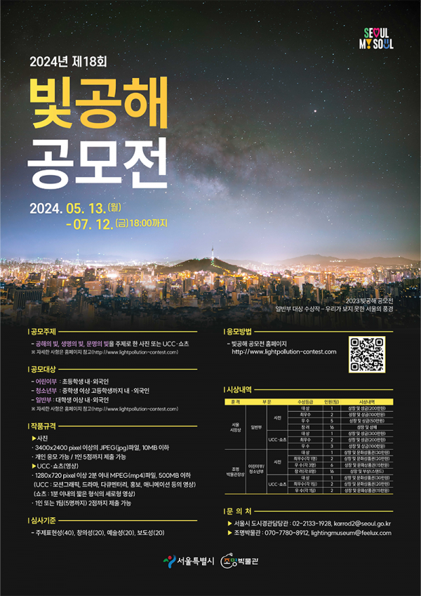 ■ 공모내용 1. 공해의 빛 - 인공조명이 무분별하고 과도하게 설치되어 생활 속에 부정적인 영향을 끼치는 사례 - 생태계와 문화자원 등에 피해를 주는 인공조명의 잘못된 사용 사례 2. 생명의 빛 - 인공조명을 적절하고 조화롭게 설치·이용하여 인간생활과 자연환경을 아름답고 풍요롭게 개선한 사례 - 인공조명과 자연 빛이 조화를 이루어 인간과 자연이 건강하게 공존하는 사례 3. 문명의 빛 - 우리의 역사, 문화, 일상 속에서 문명을 발전시키고 이롭게 한 인공조명의 모습 - 문화적 함의가 담긴 인공조명의 아름다운 모습 등 ■ 공모부문 어린이, 청소년, 일반부 ■ 참가자격 빛공해에 관심을 가지고 있는 남녀노소 내외국인 - 어린이부 : 초등학생 내외국인 - 청소년부 : 중학생이상 고등학생까지 내외국인 - 일반부: 대학생이상 내외국인 (*어린이부, 청소년부의 경우 국제학교, 홈스쿨, 휴학생도 참여가능) ■ 출품수 1인 또는 1팀(최대 5명까지) 2점 제한 ■ 참가방법 공모전 홈페이지를 통한 직접 접수 ■ 작품규격 - 1280X720 pixel 이상 2분이내 MPEG(.mp4)파일 500MB이하로 업로드 - 1인 또는 1팀(최대 5명까지) 2점 제한 * UCC : 모션그래픽, 드라마, 다큐멘터리, 홍보,애니메이션 등의 영상 * 쇼츠 : 1분이내의 짧은 형식의 영상 ■ 시상내역 어린이부·청소년부 통합대상 1점 : : 상장 및 문화상품권 30만원 최우수 2점(어1, 청1) : 상장 및 문화상품권 각 30만원 우수 2점(어1, 청1) : 상장 및 문화상품권 각 15만원 일반부 대상 1점 : 300만원 최우수 2점 : 각 200만원 우수 3점 : 각 100만원 ■ 결과발표 2024.09.27(금) |
