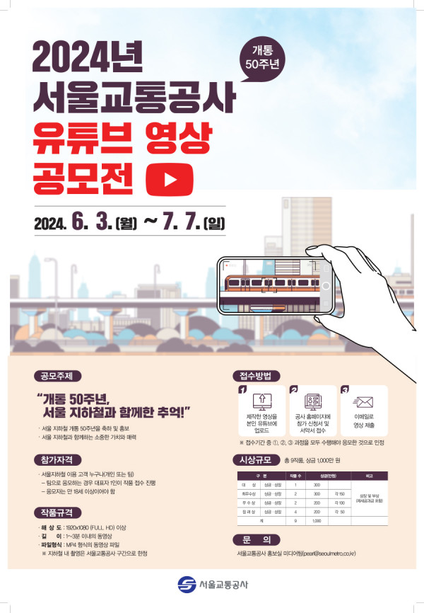 ■ 공모내용 개통 50주년, 서울 지하철과 함께한 추억! - 서울 지하철 개통 50주년을 축하 및 홍보 - 서울 지하철과 함께하는 소중한 가치와 매력 ■ 참가자격 서울 지하철 이용 고객 누구나(개인 또는 팀) - 팀으로 응모하는 경우 대표자 1인이 작품 접수 진행 - 응모자는 만 18세 이상이어야 함(‘24. 5. 8. 기준) ■ 출품수 개인(팀) 당 2작품 이내(중복 수상 불가) ■ 참가방법 다음 ①, ②, ③ 과정을 모두 수행해야 응모한 것으로 인정 ① 제작한 영상 본인 유튜브에 업로드 - 접수 및 심사기간 중 계정 전체 공개 설정 및 해시태그 필수 (#서울교통공사_2024유튜브영상공모전) ② 홈페이지( www.seoulmetro.co.kr )에 참가 신청서 접수 및 서약서 제출 - 팀 응모 시 "개인정보 활용 등 각종 동의 및 서약서”는 개인별 작성 후 한 개의 파일로 업로드 ③ 이메일( pearl@seoulmetro.co.kr ) 주소로 영상 제출 - 동영상 파일명은 [서울교통공사_2024유튜브영상공모전_참가자이름] ※ 시설물 촬영 신청 https://www.seoulmetro.co.kr:444/kr/filmList.do?menuIdx=395 ■ 작품규격 출품자 본인이 저작권을 보유한 순수 창작물 - 해 상 도: 1920*1080 (FULL HD) 이상 - 길 이: 1~3분 이내의 동영상 - 파일형식: MP4 형식의 동영상 파일 - 장 르: 다큐, 드라마, 취재, 애니메이션, Vlog, 홍보영상 등 ■ 시상내역 대상 1점 : 300만원 최우수상 2점 : 각 150만원 우수상 2점 : 각 100만원 장려상 4점 : 각 50만원 ■ 결과발표 2024.08.08 |