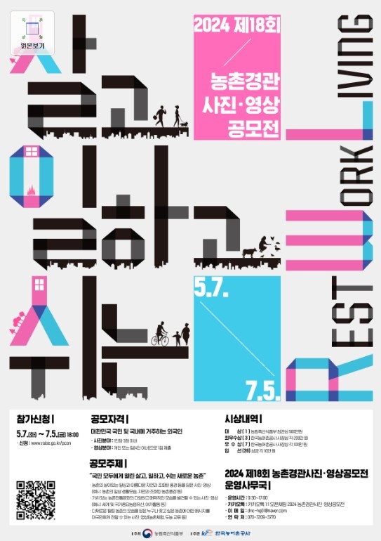 ■ 공모내용 "국민 모두에게 열린 살고, 일하고, 쉬는 새로운 농촌" ∙ 활기 넘치고 아름다우며 매력적인 농촌의 모습을 사진을 통해 발굴하여 농촌의 다양한 가치 홍보 및 사회적 공감대 확산 ∙ 도시민과 외국인에게 우리 농촌의 아름다움을 알려 농촌관광 및 귀농·귀촌 등 농촌 활력증진에 기여 - 농촌의 살아있는 일상과 아름다운 자연과 조화된 풍경 등을 담은 사진·영상(예시: 농촌의 일상 생활모습, 자연과 조화된 농촌풍경등) - 가치있는 농촌전통문화의 다양하고 매력적인 모습을 발견할 수 있는 사진·영상(예시: 세계 및 국가중요농업유산, 여가활동 등) - 다채로운 힐링농촌의 모습을 담은 누구나 찾고 싶은 농촌에 대한 메세지를 대국민에게 전할수 있는 사진·영상(농촌체험, 도농교류 등) ■ 참가자격 대한민국 국민 및 국내에 거주하는 외국인 ■ 출품수 1인당 3점 이내 ■ 참가방법 공모전 홈페이지를 통한 직접 접수 ■ 작품규격 mp4, mov 파일 권장(100MB 이내, 30초 이내) * 2023. 1. 1. ~ 2024. 7. 5. 기간 중 촬영한 사진·영상 제출 ■ 시상내역 대상 1점 : 500만원 최우수상 3점 : 각 200만원 우수상 7점 : 각 100만원 입선 39점 : 각 10만원 ※ 사진, 영상 통합 시상입니다 ■ 결과발표 2024. 9. 2.(월), 공모전 홈페이지 공고 및 수상자 개별 통보 ■ 유의사항 ∙ 제출한 작품은 접수 기간 이후 수정이나 삭제가 불가하며, 반환되지 않음 ∙ 작품 응모기준에 맞지 않는 작품은 심사대상에서 제외될 수 있음 ∙ 응모작품의 저작권은 응모자에게 귀속되며 주최(주관)측에서 제안내용 전시, 홍보, 출판 등에 사용할 권리를 가짐 - 수상작품에 대한 사용 권한은 주최 및 주관기관에 귀속되며, 이는 2차 저작물 작성권을 포함하며, 이를 일반에 공개하고 홍보물로 제작, 복제, 배포 등에 활용할 수 있음 - 응모자는 응모와 동시에, 입상 시 공모전 요강에 기재된 이용 방법 및 조건의 범위 안에서 저작물(수상작) 이용을 허락한 것 ∙ 응모한도를 초과한 응모작품은 제출 순서에 따라 사진분야는 1인당 3점, 영상분야는 1점이며, 이후 응모 작품부터 심사에서 제외됨 ∙ 해당 공모전 내 중복수상은 불가하며, 타 공모전에 기입상된 작품이거나 표절·편집·합성된 응모작품, 대리 작성된 응모작품, 출품대상·규격을 충족하지 않는 작품은 심사에서 제외되며, 시상 이후에도 수상 취소 및 상금을 환수할 수 있음 ∙ 모든 출품작은 본인이 직접 촬영·편집한 작품이어야 하며 저작권에 위배되는 작품은 심사에서 제외됨 - 사진·영상에 인물, 건축물, 개인·법인, 소유지 및 음원 등이 포함될 경우 응모자는 초상권, 저작권, 소유권, 대여권 등 법적 문제가 없어야 하며, 관련하여 발생할 수 있는 문제들을 해결한 후 응모하여야 하며, 향후 분쟁이 발생할 경우 민.형사상의 모든 법적 책임은 출품자(저작권자)에게 있음 - 드론 등 항공 촬영의 경우 촬영 구역을 식별할 수 있는 자료를 제출 ∙ 본심사 대상으로 선정된 작품의 출품자는 주관사로부터 본 심사 진행을 위해 원본 파일 제출을 요구받았을 때, 원본 파일을 제출해야 하며, 제출하지 않을 시 본심사 대상에서 제외됨 - 입상작품 중 심사기한 내에 원본 파일과 관련 서류를 제출하지 않는 경우 수상 취소 |