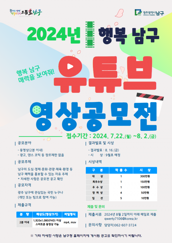 ■ 공모내용 - 남구 매력을 홍보할 수 있는 자유 주제 영상 - (도심·경제) : 백운광장 활성화(푸른길 브릿지, 미디어 월, 스트리트 푸드존) - (문화·관광) : 양림역사문화마을, 양림예술마켓, 사직타워, 빛고을 농촌테마공원, 고싸움놀이테마파크, 소확행 나눔장터 등 - (체육·환경) : 반다비체육센터, 진월복합운동장, 승촌보 파크골프장 등 ■ 참가자격 국민 누구나(개인, 팀으로 참가 가능) ■ 출품수 1인(팀)당 2편까지 가능(중복 수상 불가) ■ 참가방법 이메일 접수 : qwerty7106@korea.kr - 출품 영상파일 및 제출서류를 압축파일로 제출 - 파 일 명 : 남구영상공모전_작품명_이름(팀명).zip - 제출서류 : 참가신청서, 서약서 각 1부 / 자필서명 후 스캔본 제출 ■ 작품규격 2분 이내, 1,920x1,080(FHD) 이상, 스마트폰 동영상 가능, mp4, mov ■ 시상내역 대상 1점 : 300만원 최우수상 1점 : 150만원 우수상 1점 : 100만원 장려상 4점 : 각 50만원 입선 5점 : 각 10만원 ■ 결과발표 2024. 8. 16.(금) ※ 개별 통보 및 홈페이지, 유튜브 게시 |
