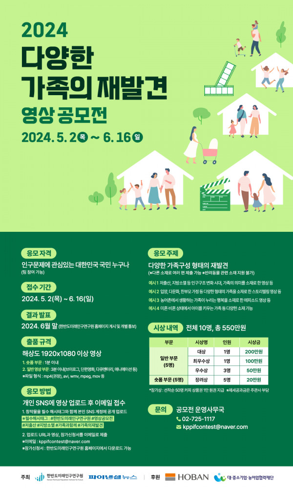 ■ 공모내용 인구구조 변화 관점에서 가족의 의미 재발견 - 다양한 가족구성 형태의 재발견 *다른 소재로 여러 편 제출 가능 · 예시 1) 저출산, 지방소멸 등 인구구조 변화 시대, 가족의 의미를 소재로 한 영상 등 · 예시 2) 입양, 다문화, 한부모 가정 등 다양한 형태의 가족을 소재로 한 스토리텔링 영상 등 · 예시 3) 농어촌에서 생활하는 가족이 누리는 행복을 소재로 한 에피소드 영상 등 · 예시 4) 미혼·비혼 상태에서 아이를 키우는 가족 등 다양한 소재 가능 ※ 반려동물 관련 소재 지원 불가 ■ 공모부문 일반부문, 숏폼부문 ■ 참가자격 인구문제에 관심있는 대한민국 국민 누구나 (팀 참여 가능) ■ 참가방법 개인 SNS에 영상 업로드 후 이메일 접수 - 창작물을 필수 해시태그와 함께 본인 SNS 계정에 게시 후 URL과 참가신청서를 이메일(kppifcontest@naver.com)로 제출 (*참가신청서는 하단 첨부파일 다운로드) - 개인 SNS에 필수 해시태그와 함께 공개 업로드 후 신청서와 영상 이메일 접수 ※ 필수해시태그 : #한반도미래인구연구원 #영상공모전 #저출산 #지방소멸 #가족과함께 #가족의재발견 ※ 선택해시태그 : 본인이 출품한 부문 키워드 – 예) #다둥이 #입양가족 #흔한남매 #귀농육아 ■ 작품규격 - 숏폼 부문 : 1분 이내 - 일반영상 부문 : 3분 이내 (브이로그, 단편영화, 다큐멘터리, 애니메이션 등) - 해상도 : 1920×1080 이상 - 파일형식 : mp4(권장), avi, wmv, mpeg, mov 등 ■ 시상내역 일반부문 대상 1점 : 200만원 최우수상 1점 : 100만원 우수상 3점 : 각 50만원 숏폼부문 장려상 5점 : 각 20만원 *참가상 : 선착순 50명 커피 상품권 1만 원권 지급 ※제세공과금은 주관사 부담 ■ 결과발표 2024년 6월 말 (한반도미래인구연구원 홈페이지 게시 및 개별 통보) |