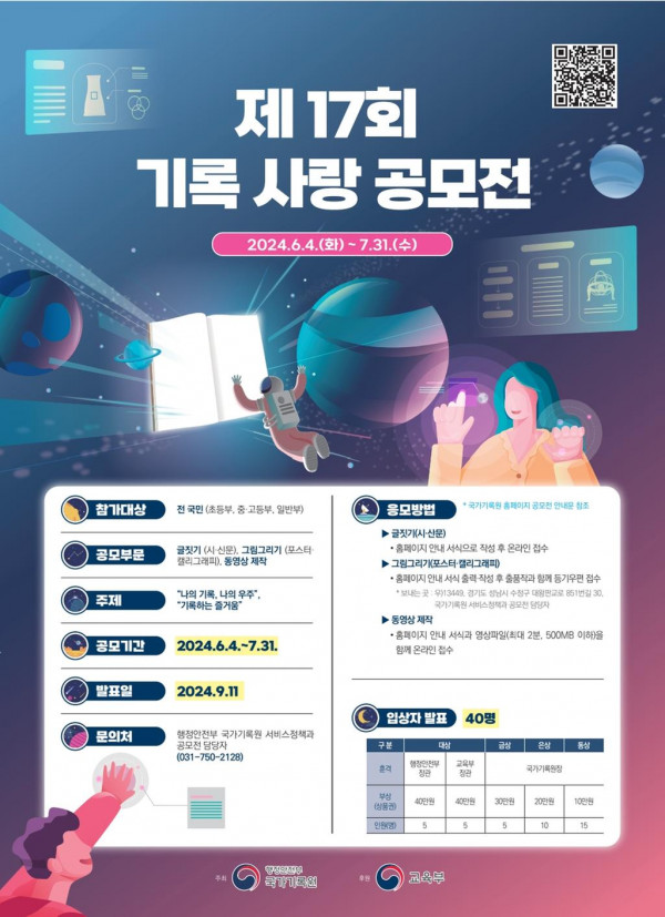 ■ 공모내용 나의 기록, 나의 우주’ - 기록과 함께하는 우주와 우리들의 이야기를 들려주세요! ‘기록하는 즐거움’ - 일상을 기록했던 즐거움을 모두에게 나누어주세요! ■ 참가자격 전 국민(초등부, 중고등부, 일반부) ■ 참가방법 공모전 홈페이지를 통한 직접 접수 ■ 작품규격 다큐, 애니메이션, 1인 방송 등 자유 형식의 순수 창작 영상(2분 이내, 500MB 이하) ■ 시상내역 대상 행정안전부장관상 5점 : 각 40만원 대상 교육부장관상 5점 : 각 40만원 금상 5점 : 각 30만원 은상 10점 : 각 20만원 동상 15점 : 각 10만원 ※ 글짓기, 그림그리기 부문과 통합시상입니다 ■ 결과발표 2024. 9. 11.(예정) ※ 국가기록원 누리집 공지 |