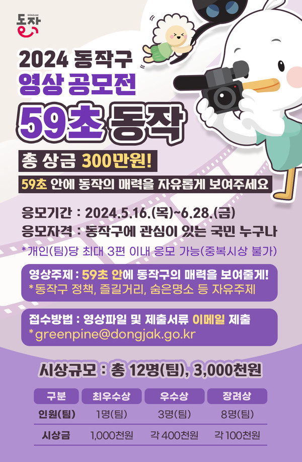 ■ 공모내용 59초 동작_59초 안에 동작구의 매력을 보여줄게! 가. 동작구의 핫플레이스, 나만 알고 있는 동작구의 숨은 명소 소개 나. 동작구에서 생활하면서 느끼는 일상의 변화나 구민으로서의 자랑 다. 동작구의 아름다운 역사, 문화, 자연경관, 명소 소개 등 자유주제 ■ 참가자격 동작구에 관심이 있는 전 국민 누구나(개인 또는 팀, 연령 무관) ■ 출품수 개인(팀)당 최대 3편 이내 응모 가능(중복시상 불가) ■ 참가방법 이메일 제출( greenpine@dongjak.go.kr ) 제출서류 등 : ①동영상 파일, ②신청서, ③개인정보 수집 및 활용동의서, ④서약서,⑤ 응모작 설명서 ※ 파일명 : 동작구 홍보영상 공모전_(성명 또는 팀명), 제출서류 자필 서명, 신청서 등 제출 문서 파일은 한글파일(hwp) 필수 ■ 작품규격 - 분량 : 동영상 세로영상 59초 이하 - 해상도 : 1080 × 1920 픽셀 이상 - 파일형식 : mp4, mov, avi 등(화면비율: 9:16) ※ 영상 내용에 동작구 관련 내용 반드시 포함되어야 함 - 형식 : 광고, 뮤직비디오, 브이로그, 애니메이션, 드라마 등 자유형식 ■ 시상내역 최우수상 1점 : 100만원 우수상 3점 : 각 40만원 장려상 8점 : 각 10만원 ■ 결과발표 2024. 8. 7.(수) ※ 심사 일정에 따라 일정 변동 가능 |