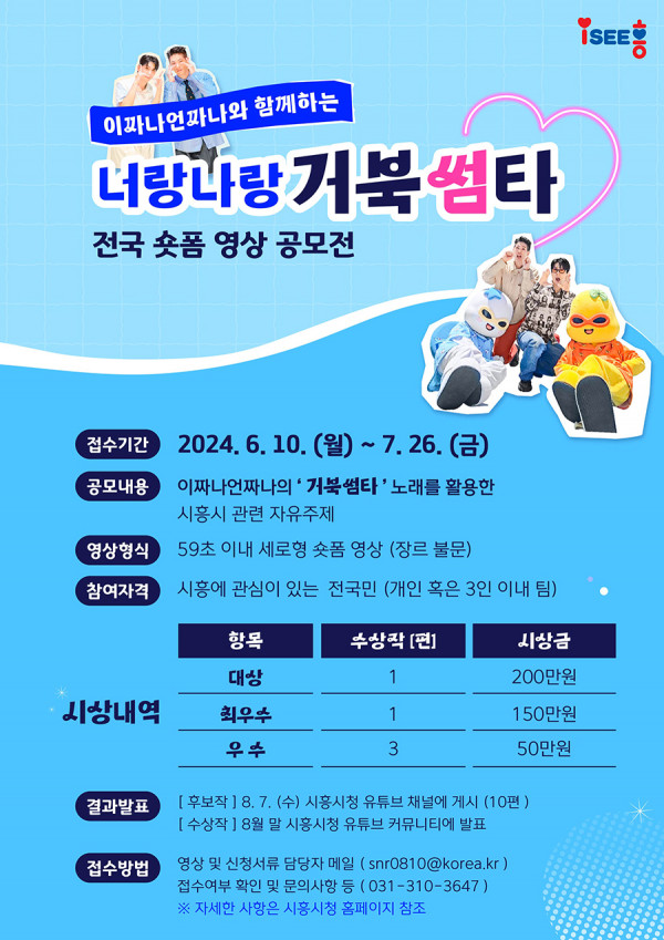 ■ 공모내용 「거북썸타」 노래를 활용한, 시흥시 관련 자유주제 영상 ○ 「거북썸타」 음원 또는 MR, 편곡, 가창본 등을 배경음악으로 삽입(필수) https://www.siheung.go.kr/sihwaho30th/bbs/view.do?mId=0401000000&bIdx=164585&ptIdx=46 ○ 타 지역과 차별화된 시흥만의 매력이 드러날 수 있는 모든 소재(사람, 장소, 제품 등) 활용 가능, 시화호와 거북섬이 들어간 음원 가사를 잘 표현하여 활용한 영상 등 ※ 시화호 및 거북섬에 대한 자세한 정보는 시흥시 누리집 참고 ( https://www.siheung.go.kr/sihwaho30th ) ■ 참가자격 지역 및 연령 제한 없음 ■ 출품수 개인(팀) 복수 응모 가능, 최대 3편 출품 가능(중복시상 불가) ■ 참가방법 영상 원본파일, 신청서류 일체를 메일로 제출 - 메일 제목에 ‘너랑 나랑 거북썸타 전국 숏폼 영상 공모전(참가자 또는 팀명)’ 표기 - 신청서류 : ①참가신청서, ②개인정보 수집·이용 동의서, ③서약서 ※ 서류 미제출 시 심사 제외(동의 체크 및 서명·날인 누락 시 미제출로 간주) ※ 팀 참가 시 전원 ②개인정보 수집·이용 동의서, ③서약서 제출 요망 ※ 미성년자의 경우 법정대리인 기재란 반드시 기재 - 제출처 : 담당자 이메일 ( snr0810@korea.kr ) ■ 작품규격 세로형, 1080×1920(9:16), 59초 이내, FHD급, MP4, MOV ■ 시상내역 대상 1점 : 200만원 최우수 1점 : 150만원 우수 3점 : 각 50만원 ■ 결과발표 2024. 8. 7.(수) 예정, 시흥시청 유튜브 채널에 공개 ■ 유의사항 - 응모작은 타 공모전에 출품되지 않은 본인의 순수 창작물이어야 합니다. - 작품 제출 후 수정 및 재접수는 불가합니다. 다만 제출서류 등이 미흡할 경우 주최 측이 보완 요구할 수 있습니다. - 신청서 기입 오류 및 미작성 등으로 연락 불가 시 시상에서 제외됩니다. - 접수 완료 여부는 시흥시 홍보담당관에서 접수일 익일까지 발송 예정으로 문자 미수신 시 홍보담당관(031-310-3647)으로 전화하여 접수 여부를 직접 확인 하여야 합니다. 또한 접수로 인한 문제(메일 전송 실패, 첨부파일 누락, 접수 결과 미확인 등) 발생 시 책임은 출품자에게 있습니다. - 작품 전체 또는 일부가 이미 유포된 것이거나 타 공모전 수상작일 경우,심사에서 제외되며 시상 후에라도 취소 및 상금 환수 조치합니다. - 응모작은 초상권, 지적재산권, 운항·항공 촬영 등 관련 법령을 준수하여 제작된 것이어야 합니다. - 초상권·지적재산권(음원, 폰트, 이미지 등) 일체는 법적인 문제가 없는 것이어야 하며, 음원 제목과 출처를 밝혀야 하는 경우 명시해야 합니다. - 제3자의 초상권 및 타인의 명예 훼손, 지적재산권 침해, 타인의 저작물 및 명의도용으로 확인될 시 심사에서 제외되며 시상 후에라도 취소 및 상금 환수 조치합니다. - 응모작 관련 분쟁 발생 시, 일체의 법적·도의적 책임은 응모자에게 있습니다. - 공고 내용 및 미공시 부분에 관한 사항은 시흥시의 해석을 따르고, 공정한 심사를 위하여 1차 심사위원 및 점수 등 심사과정은 공개하지 않으며 결과에 이의 제기 불가합니다. - 2차 시민참여 심사 및 중복 포상 조회 과정에서 저작권 · 초상권 등 공식적으로 이의제기가 있을 경우, 심사에서 제외합니다. - 2차 심사기준에 해당되는 조회수, 좋아요 수, 댓글 수 집계는 시흥시청 유튜브 채널 자체 분석 기준으로 판단하며 부정프로그램 또는 유튜브 광고 등의 사용이 확인될 경우 심사에서 제외합니다. - 심사결과에 따라 시상작 수가 조정되거나 없을 수 있습니다. - 팀 수상 시 대표자에게 포상금이 지급되며, 포상금 배분에는 관여하지 않습니다. - 응모 관련 서류는 원본서류가 아닌 온라인 제출본으로 별도의 반환 절차는 없으나, 공모 절차 종료로부터 1년간 보관 후 폐기합니다. - 수상작은 시흥시청 유튜브 및 SNS, 영상게시대 등 시흥시 공식 매체를 통한 홍보와 각종 보도자료로 활용될 수 있으며 수상작에 대한 제반 저작권은 시흥시에 귀속됩니다. - 공모일정은 사정에 따라 변경될 수 있습니다. |