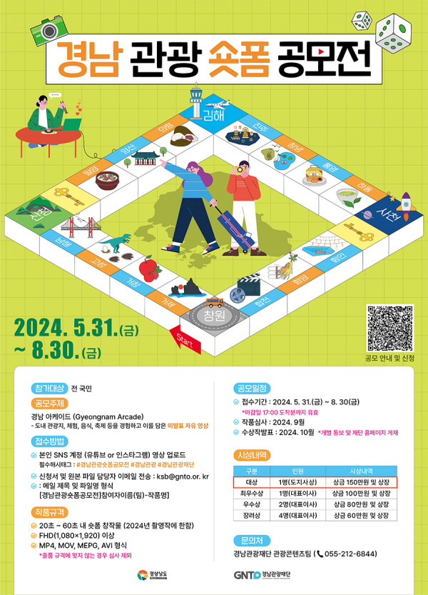 ■ 공모내용 경남관광을 소재로, 도내 관광지, 체험, 음식, 축제 등을 경험하고 이를 담은 20초~60초 이내의 자유 영상 ■ 참가자격 대한민국 국민이라면 누구나 가능 ■ 참가방법 필수 해시태그와 함께 개인 SNS(유튜브, 인스타그램 중 택1) 영상 게시 후 이메일( ksb@gnto.or.kr ) 제출 ※ 제출 방법(아래와 다를 경우 심사에서 제외될 수 있음) - 개인 SNS(유튜브 or 인스타그램) 게시 후 해시태그(#경남관광숏폼공모전 #경남관광 #경남관광재단) 작성 - 메일 제목 : [경남관광숏폼공모전]참여자이름(팀)-작품명 - 파일명 : [경남관광숏폼공모전]참여자이름(팀)-작품명 - 제출서류 : ①참가신청서, ②개인정보 수집 및 이용동의서, ③참가서약서 ④숏폼 원본 파일(파일명 양식 엄수) ■ 작품규격 20초~60초 내 숏폼 창작물 (2024년 촬영작에 한함) FHD(1,080×1,920) 이상 MP4, MOV, MEPG, AVI 형식 *출품 규격에 맞지 않는 경우 심사 제외 ■ 시상내역 대상 1점 : 150만원 최우수상 1점 : 100만원 우수상 2점 : 각 80만원 장려상 4점 : 각 60만원 ■ 결과발표 2024.10월 |