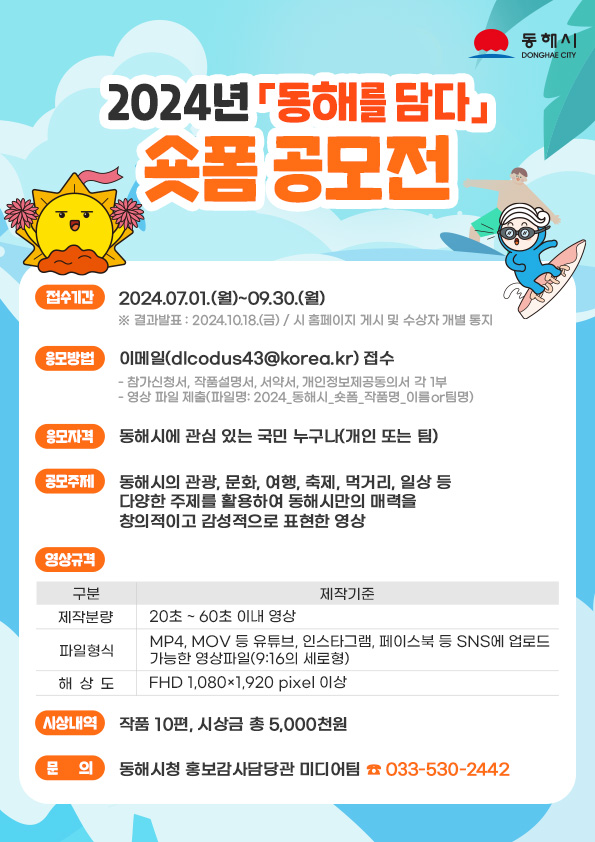 ■ 공모내용 동해시의 관광, 문화, 여행, 축제, 먹거리, 일상 등 다양한 주제를 활용하여 동해시 만의 매력을 창의적이고 감성적으로 표현한 영상 ■ 참가자격 동해시에 관심 있는 국민 누구나(개인 또는 팀) ■ 출품수 1인(팀)당 1편만 출품 가능 ■ 참가방법 - 이메일(dlcodus43@korea.kr) 접수 - 참가신청서, 작품설명서, 서약서, 개인정보제공동의서 각 1부(붙임 서식 참고) - 영상 파일 제출(파일명: 2024_동해시_숏폼_작품명_이름 or 팀명) ■ 작품규격 제작분량 : 20초 ~ 60초 이내 영상 파일형식 : MP4, MOV 등 유튜브, 인스타그램, 페이스북 등 SNS에 업로드 가능한 영상파일(9:16의 세로형) 해 상 도 : FHD 1,080×1,920 pixel 이상 ■ 시상내역 최우수상 1점 : 150만원 우수상 1점 : 100만원 장려상 3점 : 각 50만원 입선 5점 : 각 20만원 ■ 결과발표 2024. 10. 18.(금) / 市 홈페이지 게시 및 수상자 개별 통지 ■ 유의사항 - 출품영상은 동해시 내에서 촬영된 작품이어야 하며, 모든 출품영상은 공고일 기준 6개월 이내부터 접수 마감일까지 촬영된 본인의 순수 창작물이어야 합니다. - 1인(팀)당 1편만 출품 가능합니다. - 공모주제 및 영상규격 등 공모요강에 준하지 않는 출품영상은 심사 대상에서 제외합니다. - 출품영상의 전체 또는 일부가 이미 유포된 것을 응모하거나, 공모 취지에 적합하지 않은 광고성, 상업성 영상(상호, 상품 등 특정업체 및 물품을 노출하는 장면 등)은 심사 대상에서 제외됩니다. - 타 공모전에 시상 또는 수상 경력이 있는 영상, 타인영상, 유사영상, 모방영상은 심사대상에서 제외합니다. - 출품영상은 제3자의 저작권(음원, 영상, 사진, 이미지, 캐릭터 등), 초상권, 상표권, 지적재산권, 음원 등 이용에 있어 일체의 법적 문제가 없어야 하며, 이와 관련하여 발생하는 민·형사상 문제는 공모 응모자가 책임·부담합니다. - 응모참여 및 수준에 따라 시상 규모는 변경될 수 있으며, 심사결과 적합한 작품이 없을 경우 수상작을 선정하지 않을 수 있습니다. - 동해시는 선정된 영상의 소유권, 저작권, 초상권, 지식재산권 등 일체의 권리를 가지며, 필요에 따라 2차 저작물로 수정·변형하여 사용할 수 있습니다. - 공모 출품영상은 동해시 공식 SNS 등을 통해 불특정 다수에게 공유됩니다. - 접수된 출품작 및 관련서류 등은 반환되지 않습니다. - 심사내용은 공개되지 않으며, 심사결과에 대해 어떠한 이의도 제기 할 수 없습니다. - 시상금 수여에 따른 제세공과금은 수상자가 부담합니다. 팀 수상 시 대표자에게 시상금이 지급되며, 시상금 배분에는 관여하지 않습니다. - 상기 유의사항 내용 중 위반 사실이 확인될 경우 심사대상에서 제외 되며, 수상 후 이러한 사실이 밝혀졌을 경우 입상 취소 및 시상금 환수 등 법적 조치를 받을 수 있습니다. - 공고내용 해석에 대한 사항과 그 외 언급되지 않은 사항은 동해시의 결정에 의하며, 공모전에 참가한 이는 위의 모든 내용을 동의한 것으로 간주합니다. |