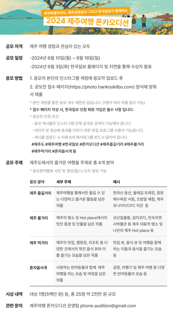 ■ 공모내용 제주도에서의 즐거운 여행을 주제로 총 4개 응모 분야가 있습니다. * 응모분야별로 사진 및 영상(릴스) 모두 응모 가능 제주 즐길거리 - 세부 주제 : 제주여행을 통해서만 즐길 수 있는 다양하고 즐거운 활동을 담은 작품 - 예시 : 한라산 등산, 둘레길 트레킹, 중문해수욕장 서핑, 조랑말 체험, 제주유나이티드FC 직관 등 제주 볼거리 - 세부 주제 : 제주의 명소 및 Hot place에서의 멋진 풍경 및 인물을 담은 작품 - 예시 : 성산일출봉, 섭지코지, 민속자연사박물관 등 제주 대표적 명소 및 나만의 제주 Hot place 등 제주 먹거리 - 세부 주제 : 제주의 맛집, 캠핑장, 리조트 등 다양한 곳에서의 멋진 음식 뷰와 이를 즐기는 모습을 담은 작품 - 예시 : 맛집 뷰, 음식 뷰 및 여행을 함께 하는 이들과 음식을 즐기는 모습 등 혼자옵서개 - 세부 주제 : 사랑하는 반려동물과 함께 제주 여행을 하는 모습 및 여정을 담은 작품 - 예시 : 공항, 비행기 및 제주 여행 중 다양한 반려동물의 모습 등 ■ 공모부문 제주 즐길거리, 제주 볼거리, 제주 먹거리, 혼자옵서개 ■ 참가자격 대한민국에 거주하고 있는 누구나 지원이 가능합니다. ■ 출품수 응모 개수 제한은 없습니다. (1명이 여러 작품 응모 가능) ■ 참가방법 1. 응모자 본인의 인스타그램 계정에 응모작 업로드 후 2. 제주여행 폰카오디션 접수 양식에 맞춰서 응모자 정보와 인스타그램에 올린 게시물 피드 url을 등록합니다. * 응모 개수 제한은 없습니다. (1명이 여러 작품 응모 가능) * 접수 페이지 작성 시, 한국일보 닷컴 회원 가입은 필수 사항 입니다. * 응모작 인정 조건 - 응모 게시물은 인스타그램 전체 공개로 검색이 가능해야 합니다. - 이미지 및 영상에 효과를 더하기 위한 편집 프로그램 사용이 가능합니다. - 게시물 업로드 시 아래 8개 해시태그를 반드시 달아야 합니다. #제주도 #제주여행 #한국일보 #폰카오디션 #제주즐길거리 #제주볼거리 #제주먹거리 #혼자옵서개 등 ■ 시상내역 대상 1점 : 500만원 최우수상 4점 (부문별 1점) : 각 100만원 우수상 4점 (부문별 1점) : 각 50만원 장려상 4점 (부문별 1점) : 각 30만원 ※ 대상은 사진, 영상 통합 시상입니다 ■ 결과발표 2024년 09월 03일(화), 한국일보 홈페이지 및 지면 |