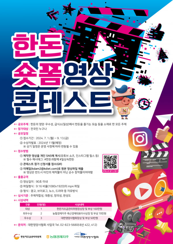 ■ 공모내용 한돈의 영양·우수성, 급식소(일상)에서 한돈을 즐기는 모습 등을 소재로 한 모든 주제 ■ 참가자격 전국민 누구나 ■ 참가방법 ① 제작한 영상을 개인 SNS에 게시(유튜브 쇼츠, 인스타그램 릴스 등) ※ 필수 해시태그: #한돈과함께 #일상속한돈 ② 콘테스트 참가 신청서를 접수(QR) : https://forms.gle/bNGCH5EhVKUskb197 ③ 이메일( kdam2@kdiet.com )로 원본 영상파일 제출 ※ 영상은 반드시 타인의 제작물이 아닌 순수 창작물이어야함 ■ 작품규격 ① 영상길이: 90초 이내 ② 파일형식: 9:16 비율(1080x1920)의 mp4 파일 ③ 형식 : 광고, 브이로그, 뉴스, 드라마 등 자유방식 ■ 시상내역 대상 1점 : 100만원 최우수상 2점 : 각 70만원 우수상 3점 : 각 50만원 ■ 결과발표 2024년 11월(예정) |