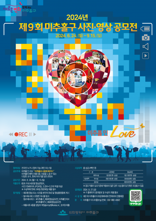 ■ 공모내용 “Michuhol in love”미추홀과 사랑에 빠지다 (예시) 미추홀의 매력, 아름다움, 사랑을 느낄 수 있는 다양한 과거 현재의 이야기 - 미추홀의 사람, 풍경, 골목, 음식 추억, 명소 등 미추홀구에 대해 사랑을 느끼고, 나눌 수 있는 다양한 콘텐츠 ※ 미추홀구 지역 내에서 촬영한 사진·영상으로,방송 및 구 홍보에 적합한 소재라면 주제에 제한 없음 ■ 참가자격 전 국민 누구나(개인 또는 팀) ■ 출품수 1인(1팀)의 응모작 수는 2편 이내로 제한하며, 중복 수상은 불가능함. ■ 참가방법 네이버폼 접수 후 제출서류 4종 이메일( jenny0@korea.kr )로 제출 ① 콘텐츠를 출품자 SNS 계정에 업로드(2024년 이후 게시분부터 참여 가능) (필수해시태그 #미추홀구_제9회사진영상공모전_미추홀인러브 #미추홀릭TV_제9회사진영상공모전)