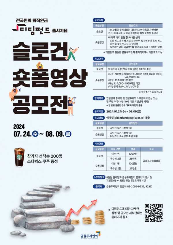 ■ 공모내용 디딤펀드 음원활용영상 또는 디딤펀드 소개영상 - 디딤펀드 음원 배경의 창작안무, 일상영상 등 디딤펀드 음원을 활용한 자유 창작영상 ※ 금융투자협회 홈페이지 공지사항 게시글에서 디딤펀드 음원 다운로드 가능 - 장르제한 없이 디딤펀드를 쉽고 재치 있게 소개하는 영상 ■ 참가자격 연금업계 종사자 및 연금투자와 노후준비에 관심 있는 전 국민 누구나(만 19세 미만 미성년자 제외) ■ 출품수 1인 최대 1작품 ■ 참가방법 이메일( didimfund@kofia.or.kr )로 제출 ※ 이메일 제목 : “공모부문(슬로건 또는 숏폼영상) + 성명 + 출생 연도” 제출서류 - 공모전 참가신청서(별첨2, 개인정보 동의서 포함) 1부 - 디딤펀드 숏폼영상 파일 첨부 ■ 작품규격 - (장르) 제한없음(창작안무, 애니메이션, 드라마, 패러디, 코미디, 노래, 브이로그 등) - (분량) 15초이상 1분 미만 - (해상도) 1,080×1,920픽셀 이상 - (파일형식) MP4, AVI, MOV 등 ■ 시상내역 대상 1점 : 100만원 우수상 2점 : 각 25만원 ■ 결과발표 금융투자협회 홈페이지( www.kofia.or.kr ) 공지 및 수상자 개별 통지(8월말) ■ 유의사항 - 공모전 심사기준 및 평가결과는 비공개이며 응모자는 결과에 대해 이의를 제기할 수 없음 - 응모자는 출품작이 제3자의 저작권, 초상권 등을 침해하지 않도록 주의의무를 다 하여야 함 - 응모작이 타인의 저작권을 침해하거나 제3자에 대한 명예훼손 등 법적 분쟁이 발생할 경우, 민·형사상의 모든 책임은 응모자에게 있음 - 타 공모전에서 입상한 작품은 응모할 수 없음 - 응모작은 반드시 본인의 창작물이어야 하며, AI 프로그램(챗 GPT 등)을 사용해서는 안 됨 - 심사결과에 따라 시상내용이 조정될 수 있으며, 심사 기준을 충족하는 작품이 없는 경우 수상작을 선정하지 않을 수 있음 - 동일, 유사 내용의 응모작 접수 시 선제출자의 응모작이 우선함 - 응모작은 반환하지 않음 - 수상작의 저작재산권은 주최 측에 귀속 - 수상자가 연락불능 등으로 시상이 불가능한 경우 수상 포기로 간주 - 상금에 대한 제세공과금은 수상자가 부담 - 공모전 일정은 주최 측의 사정에 의해 변경될 수 있음 |