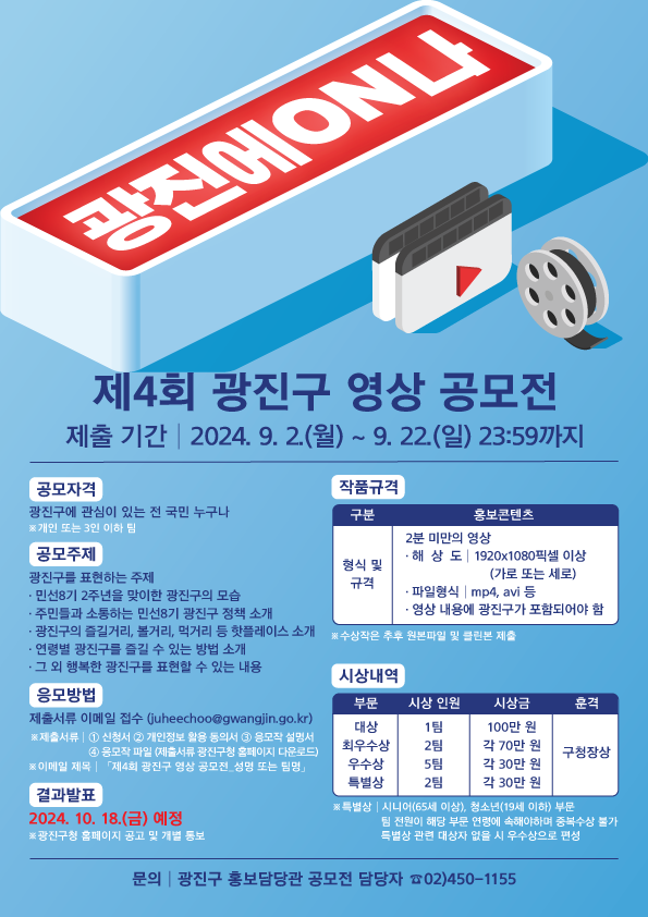 ■ 공모내용 광진구를 표현하는 주제 예시) 〇 민선8기 2주년을 맞이한 광진구의 모습 〇 주민들과 소통하는 민선8기 광진구 정책 소개 〇 광진구의 즐길거리, 볼거리, 먹거리 등 핫플레이스 소개 〇 연령별 광진구를 즐길 수 있는 방법 소개 〇 그 외 행복한 광진구를 표현할 수 있는 내용 ■ 참가자격 광진구에 관심 있는 누구나(개인 또는 3인 이하의 팀) ■ 출품수 1인(팀) 당 다작 응모는 가능하나, 중복 수상은 불가 ■ 참가방법 제출서류: ①신청서 ②개인정보 활용 동의서 ③응모작 설명서 ④응모작 파일 - 광진구청 홈페이지에서 제출서류 서식 다운로드 - 제출서류에 자필 서명 후 스캔 또는 사진촬영 후 첨부 제출방법: 이메일( juheechoo@gwangjin.go.kr ) - 이메일 제목은 “제4회 광진구 영상 공모전_성명 또는 팀명”으로 작성 ■ 작품규격 브이로그, 뮤직비디오, 다큐멘터리, 드라마 등 자유형식의 영상물 - 2분 미만의 영상 - 해 상 도: 1,920×1,080픽셀 이상(가로 또는 세로) - 파일형식: MP4, AVI 등 - 영상 내용에 광진구가 포함되어야 함 ■ 시상내역 대상 1점 : 100만원 최우수상 2점 : 각 70만원 우수상 5점 : 각 30만원 특별상 2점 : 각 30만원 ■ 결과발표 2024. 10. 18.(금) 예정 ※광진구청 홈페이지 공고 및 개별 통보 |