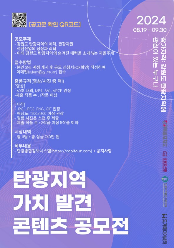 ■ 공모내용 강원도 탄광지역(태백, 삼척, 영월, 정선) 관련 콘텐츠 발굴 - 강원도 탄광지역(태백, 영월, 삼척, 정선)의 매력 ex) 탄광지역의 즐길거리, 놀거리, 먹거리 등 - 강원도 탄광지역 관광자원 홍보 영상 ex) 태백, 영월, 삼척, 정선지역의 행사, 축제, 관광자원 등 - 석탄산업의 성장과 쇠퇴 ex) 탄광 주변 경관 및 인근 마을 풍경, 지역 주민 등 - 이외 강원도 탄광지역의 숨겨진 매력을 소개하는 자율주제 ■ 참가자격 강원특별자치도 탄광지역에 관심이 있는 누구나 * 개인 또는 팀으로 참여 가능, 중복시상 불가, 내·외국인 모두 응모 가능 ■ 참가방법 본인 SNS 계정 게시 후 이메일 접수( yjkim@gi.re.kr ) ※ 이메일 접수시 공모신청서(붙임1), 분쟁동의서(붙임2)와 콘텐츠 파일 첨부 ※ 파일명: ‘공모신청서_(신청자 대표명)’, ‘분쟁동의서_(신청자 대표명)’, ‘[숏폼/영상]콘텐츠 제목_(신청자 대표명)’ ■ 작품규격 - 카메라, 캠코더, 스마트폰, 드론 등 다양한 장비 활용 가능 - (영상) 브이로그, 패러디, 다큐, 플래시몹 등 모든 순수창작 장르 영상 - (해상도 1920*1080 pixel 이상) 1분 이내 영상 콘텐츠 원본 파일 저장 및 보관 고화질 세로 영상(1작품 이상) * MP4, AVI, MPGE 등 온라인 게재 가능 동영상 파일 * 수상작은 수상작 및 원본파일(무자막 클린본) 제출 필수 ■ 시상내역 1등 1점 : 200만원 2등 1점 : 100만원 3등 5점 : 각 50만원 ■ 결과발표 24.10.11.(금) ■ 유의사항 - 수상작에 대해 표창장과 시상금을 지급하는 경우, 콘텐츠에 대한 권리는 강원특별자치도에 귀속됨 ※ 단, 사전 협의를 득할 경우 제안자의 권리 행사 가능 - 타 공모전 수상작, 타인의 저작물 명의 도용이 발견된 경우 심사에서 제외될 수 있으며, 입상 후 이와 같은 사실이 발견된 경우에는 입상이 취소될 수 있음 - 모든 출품작은 제3자의 초상권, 저작권 등 기타 제반권리를 침해해서는 안되며, 표절·도용 등의 분쟁 발생 시 모든 민형사상의 법적 책임은 출품자 본인에게 있음 - 응모된 콘텐츠는 홈페이지를 통해 공개될 수 있으며, 수상작은 제안자의 동의를 얻어 제3자에게 제공하거나 2차 저작물로 활용될 수 있음 |
