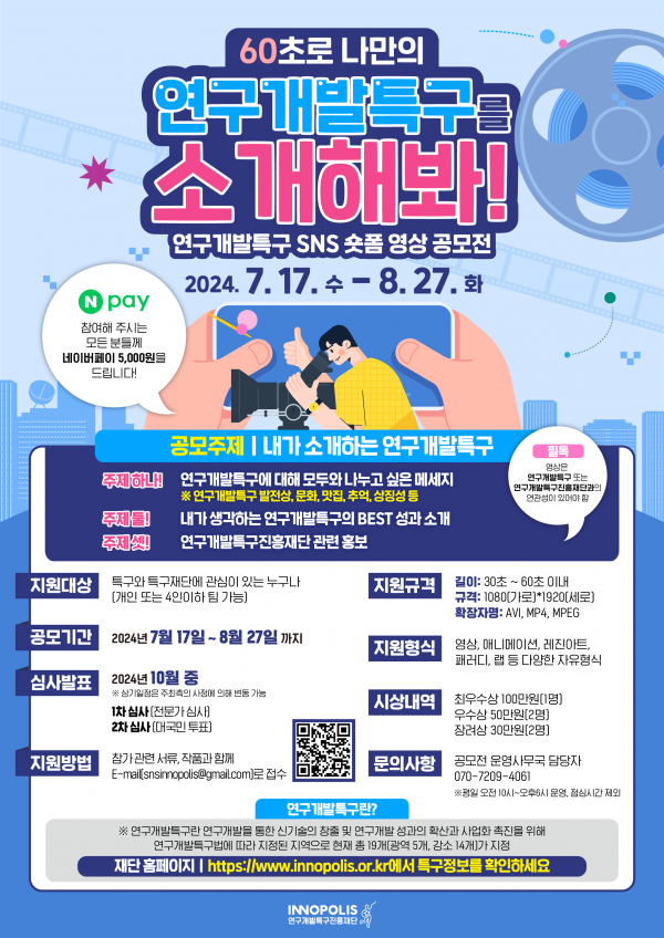 ■ 공모내용 - 연구개발특구에 대해 모두와 나누고 싶은 메세지 *연구개발특구 발전상, 문화, 맛집, 추억, 상징성 등 - 내가 생각하는 연구개발특구의 BEST 성과 소개 - 연구개발특구진흥재단 관련 홍보 ■ 공모전 기간 연장 기념 혜택 참여해 주시는 모든 분들께 네이버페이 5,000원을 드립니다! * 기존 참여자 포함 / 1인 1회 지급, 중복 지급 불가공모내용 ■ 참가자격 특구와 특구재단에 관심 있는 누구나! (개인 또는 4인 이하 팀 가능) ■ 출품수 1인당 2점 이내, 중복수상 불가 ■ 참가방법 - 참가 관련 서류 및 작품을 이메일로 접수 - 이메일( snsinnopolis@gmail.com ) ■ 작품규격 - 영상, 애니메이션, 레진아트, 패러디, 랩 등 다양한 자유형식 제작 - 길이 : 30초 ~ 60초 이내의 영상 - 규격 : 1080(가로)*1920(세로) - 확장자명 : AVI, MP4, MPEG ■ 시상내역 (최우수상) 100만원 (우수상) 50만원 / 2명 (장려상) 30만원 / 2명 ■ 결과발표 2024.10월 초 ■ 유의사항 - 동일/유사한 내용이 2건 이상 접수될 경우, 먼저 응모된 작품이 우선하며 중복하여 시상하지 않음 - 응모작품이 다른 공모전에 출품되었거나 표절인 경우에는 심사 대상에서 제외되며, 입상한 이후라도 이와 같은 사실이 밝혀진 경우 수상 취소 및 상금은 환수됨 - 응모작품은 디자인보호법, 저작권법 등 관련 법률을 준수한 것을 전제로 하여 이와 관련한 분쟁 발생 시 모든 책임은 출품자에게 있음 - 수상작은 재단 SNS 게재 등 연구개발특구진흥재단의 홍보 자료로 활용할 계획이며, 수상자는 콘텐츠를 공익적 목적으로 일부 변형‧수정하여 이용하는 것에 동의하여야 함 - 공모전 신청 시 작성한 인적사항은 공모전 목적으로만 사용함 - 창작료에 대한 제세공과금은 수상자 본인 부담이며, 세금 공제 후 지급 |