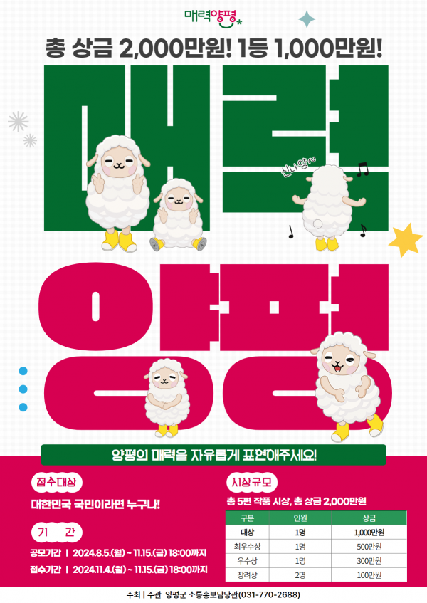 ■ 공모내용 매력양평!(양평의 매력을 자유롭게 표현할수 있는 자율주제) ① 양평 미(美:) 관광지, 명소, 자연 문화 등 아름다운 양평 모습 소개 ② 양평 맛(味): 특산물, 지역음식, 맛집 등 맛있는 양평 명물 소개 ③ 양평살이: 양평과 연관된 에피소드, 경험담 등 나의 이야기 소개 ■ 공모부문 ■ 참가자격 대한민국 국민 누구나 ■ 출품수 1인(팀)당 1개 작품 ■ 참가방법 - 이메일접수 : lsh070128@korea.kr ※ 2024. 11. 15.(금) 18:00 접수 건까지 유효하며, 이메일 발송 후 담당자 유선 연락하여 메일 접수 여부 확인(☎031-770-2688) - 제출자료 : 작품(영상), 참가신청서(개인정보 수집·이용 동의서 및 서약서 포함) ① 출품작 원본파일 1인(팀)당 1개 작품 ② 공모전 참가 신청서 [붙임1] 1부 * 서명필수 ③ 개인정보 수집·이용 동의서약서 [붙임2] 1부 * 서명필수 ■ 작품규격 동영상(avi, mp4), 5분 내외(±10초), FULL HD(1920×1080) 이상 ■ 시상내역 대상 1점 : 1000만원 최우수상 1점 : 500만원 우수상 1점 : 300만원 장려상 2점 : 각 100만원 ■ 결과발표 2024. 12월 중(개별통지 및 양평군 홈페이지 공고) ■ 유의사항 - 응모작은 공고일 기준 1년 이내부터 접수 마감일까지 촬영된 본인의 순수창작물만 출품 가능합니다. - 타 공모전 출품 및 수상 내역이 없어야 하며 타인의 저작물의 표절, 도용 또는 타 공모전 중복 응모한 사실이 확인될 경우 심사대상에서 제외되며, 위반사실이 수상 이후 밝혀질 경우, 수상 취소 및 시상금이 환수되고 이에 대하여 이의를 제기할 수 없습니다. - 수상작에 관한 일체의 저작권 및 사용권은 양평군에 귀속되며, 온라인 및 오프라인 채널에 홍보의 목적으로 활용될 수 있습니다. - 수상작의 활용에 관한 대가 지급은 시상금으로 갈음하며, 홍보 목적 및 취지에 맞게 일부 수정 및 보완하여 사용할 수 있습니다. - 수상작에 한하여 편집되지 않은 원본 영상물을 요청할 수 있으며, 향후 수정 및 변형하여 2차 저작물로 사용할 수 있습니다. - 초상권 및 표절/도용 등 저작권(저작재산권, 저작인격권) 침해 등의 분쟁 발생 시 모든 민·형사상 책임은 응모자가 부담하여야 합니다. - 공모주제 및 작품규격, 공모기간 등 공고 내용에 맞지 않는 작품을 제출할 경우 심사에서 제외될 수 있으며, 심사 결과에 대해 이의를 제기할 수 없습니다. - 응모를 위해 제출된 작품과 관련 서류는 반환되지 않습니다. - 심사 결과 작품 완성도가 낮거나 심사기준에 부합하지 않은 경우 수상작을 선정하지 않을 수 있습니다. - 심사내용 및 과정은 공개하지 않으며 심사위원 구성과 심사기준에 따른 심사결과에 대해 이의를 제기할 수 없습니다. - 팀 또는 공동 수상시 상장은 공동명의로 한 장만 수여되고, 시상금은 대표자(출품자)에게 지급되며 배분문제에 관해 양평군은 일체 관여하지 않습니다. - 응모자가 작품을 접수한 이후 응모작 반환을 요구한 경우, 입상하지 않은 경우에 한하여 응모작은 응모자에게 반환하되, 반환과 관련된 추가 비용이 발생하는 경우 응모자의 부담으로 반환됩니다. - 항공촬영(드론 등)으로 촬영한 장면이 포함된 경우, 유관기관의 허가 및 승인, 항공안전법 등 관련 법률 및 규제를 준수하여야 하며 심사과정 또는 시상 이후 관련내용 위반 사실이 적발될 경우 수상 취소 및 시상금이 환수되며 이에 대해 이의를 제기할 수 없습니다. - 저작권 침해 등으로 인한 민·형사상 분쟁과 그에 따른 개인 및 양평군에 피해가 발생할 경우 응모자 본인에게 모든 책임이 귀속됩니다. |