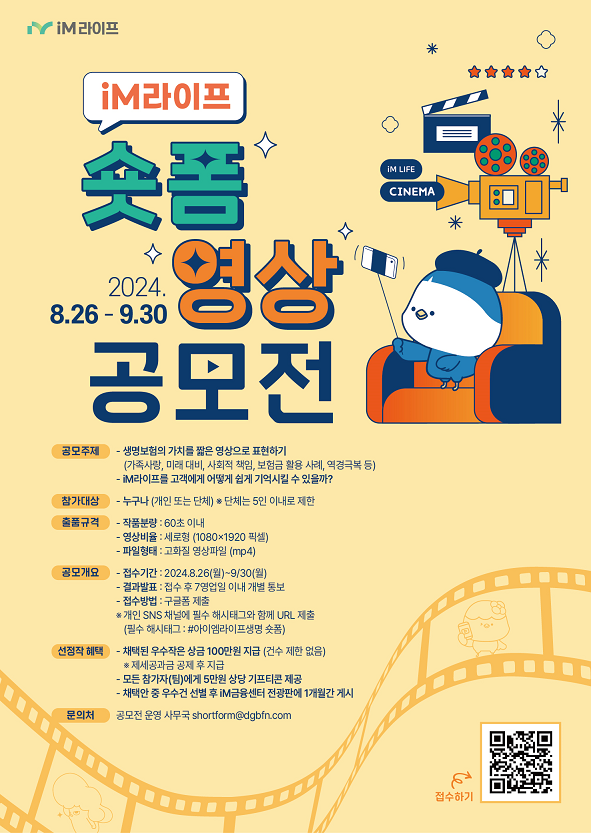 ■ 공모내용 - 생명보험의 가치를 짧은 영상으로 표현하기 (가족사랑, 미래 대비, 사회적 책임, 보험금 활용 사례, 역경극복 등) - iM라이프를 고객에게 어떻게 쉽게 기억시킬 수 있을까? ■ 참가자격 누구나 (개인 또는 단체) - 단체는 5인 이내로 제한 ■ 출품수 - 1인(1팀) 최대 3개 작품까지 응모 가능 - 타 공모전 수상작, 타 저작물 표절작 응모 불가 ※ 표절, 도용, 초상권 침해 등 부정행위 발생 시 채택 취소 ■ 참가방법 온라인 구글폼 접수 - 작품을 필수 해시태그와 함께 본인 SNS 계정 업로드 후 URL 제출 (※ 전체 공개 필수, 비공개일 경우 심사 불가) ※ 필수 해시태그 : #아이엠라이프생명 숏폼 ※ 채택 시 원본 파일 별도 제출 ■ 작품규격 - 작품분량 : 60초 이내 - 영상비율 : 세로형 (1080×1920 픽셀) - 파일형태 : 고화질 영상파일 (mp4) ■ 시상내역 ○ 채택된 작품은 상금 100만원 지급(건수 제한 없음) ※ 상금은 제세공과금 공제 후 지급 ○ 모든 참가자(팀)에게 5만원 상당 기프티콘 제공 ○ 채택안 중 우수건 선별 후 iM금융센터 전광판에 1개월간 게시 ■ 결과발표 접수 후 7영업일 이내 개별 통보 ■ 유의사항 ○ 출품작은 반드시 응모자가 직접 기획·제작한 창작물로, 접수 마감일까지 다른 공모전에서 수상한 이력이 없어야 합니다. ○ 제출기한을 초과하여 제출한 작품에 대해서는 접수하지 않습니다. ○ 타 저작물 표절 작품, 신청서 허위작성 등 부정행위가 밝혀진 경우 선정에서 제외되며, 채택 후에도 채택이 취소될 수 있습니다. (지급된 상금은 반환) ○ 출품작은 초상권, 저작권, 지적소유권, 재산권, 대여권 등 (사진, 이미지, 영상, 폰트 등)의 이용에 법적인 문제가 없어야 하며, 원 저작자의 허락이 필요한 경우 이용 허가를 받은 후 활용해야 합니다. 이와 관련 분쟁 발생 시 응모자가 모든 책임을 부담합니다. ○ 출품작의 저작권은 응모자에 있으며, 채택작에 한하여 주최측이 저작물을 공모전의 취지와 목적을 달성하기 위해 복제권과 전시권, 배포권을 비영리적으로 사용하는 것에 동의해야 합니다. ※ 채택작의 저작재산권에 대한 이용료는 상금으로 대체 ○ iM라이프는 특별한 사정이 없는 한 채택작을 원본 그대로 사용하며, 불가피한 사정에 의해 저작물을 일부 편집하여 사용할 경우 원작의 본질적인 내용을 변경하지 않는 범위 내에서 수정할 수 있습니다. ○ 항공 촬영(드론) 작품의 경우, 유관부서의 허가 및 승인, 항공 안전법, 기타 관련 법적 규제를 준수한 때에 한해 접수 가능하며, 촬영에 따른 모든 법적 책임은 응모자에게 있습니다. ○ 작품 접수 시 개인정보수집에 동의해야 하며, 동의하지 않은 경우 공모전 참여가 제한됩니다. ○ 출품작은 부정행위 검증 목적으로 외부에 공개될 수 있습니다. ○ 상금 입금 계좌명과 출품작 대표자명이 동일해야 하며, 잘못된 개인정보 입력 등으로 인한 불이익은 주최측이 책임지지 않습니다. ○ 저작권과 관련하여 분쟁이 발생하는 경우 응모자나 주최기관은 한국저작권위원회에 조정을 신청해 해결할 수 있으며, 양 당사자는 원만한 분쟁 해결을 위해 상호 노력합니다. ○ 공모전에 작품을 제출한 자는 위의 모든 내용에 동의한 것으로 간주합니다. |