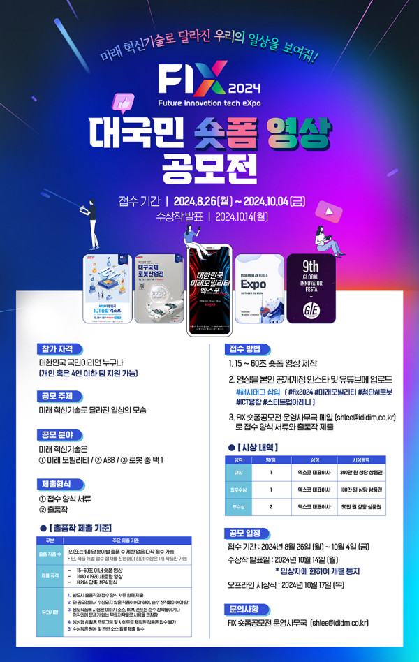 ■ 공모내용 - 미래 혁신기술로 달라진 일상의 모습 - 미래 혁신기술은 ① 미래 모빌리티 / ② ABB / ③ 로봇 중 택 1 ■ 참가자격 대한민국 국민이라면 누구누 (개인 혹은 4인 이하 팀 지원 가능) ■ 출품수 1인 출품수 제한 없음 다작 접수 가능 * 단, 작품 개별 접수 절차를 진행해야 하며 수상은 1개 작품만 가능 ■ 참가방법 1. 15~60초 숏폼 영상 제작 2. 영상을 본인 공개계정인스타 및 유튜브에 업로드 #해시태그 삽입 (#fix2024 #미래모빌리티 #첨단AI로봇 #ICT융합 #스타트업아레나) 3. FIX 숏폼공모전 운영사무국 메일( shlee@ididim.co.kr )로 접수 양식 서류와 출품작 제출 ■ 작품규격 - 15 ~ 60초 이내 숏폼 영상 - 1080 X 1920 세로형 영상 - H.264 압축, MP4 형식 ■ 시상내역 대상 1점 : 300만원 상당 상품권 최우수상 1점 : 100만원 상당 상품권 우수상 2점 : 50만원 상당 상품권 ■ 결과발표 2024년 10월 14일 |