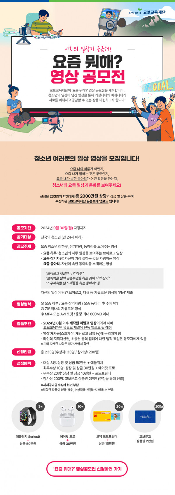 ■ 공모내용 요즘 청소년의 하루, 장기자랑, 동아리를 보여주는 영상 - 요즘 하루: 청소년의 하루 일상을 보여주는 브이로그 영상 - 요즘 장기자랑: 자신이 가장 잘하는 것을 자랑하는 영상 - 요즘 동아리: 자신이 속한 동아리를 소개하는 영상 “브이로그 재질의 나의 하루” “슬릭백을 넘어 공중부양을 하는 것이 나의 장기” “스우파처럼 댄스 배틀을 하는 동아리” 등 자신의 일상이 담긴 브이로그, 다큐 등 자유로운 형식의 ‘영상’ 제출 ■ 참가자격 전국의 청소년 (만 24세 이하) ■ 참가방법 교보교육재단 홈페이지( https://www.kbedu.or.kr/ ) 온라인 신청 ■ 작품규격 ① 요즘 하루 / 요즘 장기자랑 / 요즘 동아리 中 주제 택1 ② 7분 이내의 자유로운 형식 ③ MP4 또는 AVI 포맷 / 용량 최대 800MB 이내 ■ 시상내역 - 대상 3명: 50만원 + 애플워치 - 최우수상 10명: 30만원 + 에어팟 프로 - 우수상 20명: 10만원 + 포토프린터 - 참가상 200명: 교보문고 상품권 2만원 (추첨을 통해 선발) ※제세공과금 수상자 본인 부담 ※적합한 작품이 없을 경우, 수상작을 선정하지 않을 수 있음 ■ 유의사항 - 2024년 8월 이후 제작된 미발표 영상이어야 하며 교보교육재단 유튜브 채널에 단독 업로드 될 예정 - 영상 재가공(쇼츠제작, 재단로고 삽입 등)에 동의해야 함 - 타인의 지적재산권, 초상권 등의 침해에 대한 법적 책임은 응모자에게 있음 ※ 기타 자세한 사항은 참가 서약서 확인 |