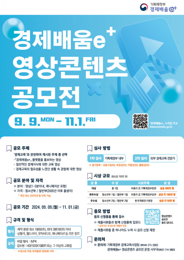 ■ 공모내용 ᄋ ‘경제교육’과 관련하여 제시된 주제 중 선택 -「경제배움e+」 플랫폼을 홍보하는 영상 - 일반적인 경제지식에 대한 교육 영상 * (예시) 잘못알고 있는 경제상식, 나만 알고있는 경제꿀팁 등 - 경제교육의 필요성을느꼈던 생활 속 경험에 대한 영상 * (예시) 경제에 대한 개념 이해를 바탕으로 합리적 선택을 했던 경험, 소비 또는 재정교육을통해 경제 습관을 고쳤던 경험, 교육을 받지 않아 후회한 경험 ※ 응모작은 순수 창작 영상물이어야 하며, 「경제배움e+」 누리집의 콘텐츠중제작기관이 ‘기획재정부’/‘KDI'/'기획재정부/KDI'인 자료에 한하여 필요시활용할 수있습니다. 이 경우 활용영상은 전체영상의 30% 이하여야 하며, 이 경우 영상의 출처를 반드시 명시하여 주시기 바랍니다. ■ 공모부문 청소년부 / 일반부 ■ 참가자격 청소년부 / 일반부(2005년 이후 출생자)* 개인 또는 3인이내 팀 단위 가능 ■ 출품수 1인 또는 팀 포함하여 1인당 3편까지 출품 가능하나, 수상은 1편만 가능 ■ 참가방법 영상물 파일과 함께 신청폼을 통해 작품 접수 https://forms.gle/tnL7ZajC7jjjB1X59 ■ 작품규격 - 형식 : 제작 분량 최소 1분(60초), 최대 3분(180초) 이내, 상황극, 웹드라마, 뮤직비디오, 애니메이션 등 모든 장르 - 규격 : 파일 형식 : MP4, 원본 : FHD(1920X1080P) 또는 그 이상의 고화질, 접수본 : HD(1920X1080P) 또는 그 이상의 고화질(최대용량 500MB 이하) * 추후 수상작으로 선정 시 고화질 원본파일을 요청할 수 있습니다 ■ 시상내역 대상 1점 : 300만원 최우수상 2점(부문별 1점) : 각 100만원 우수상 4점(부문별 2점) : 각 50만원 ■ 결과발표 2024. 12월 中 ■ 유의사항 ᄋ참가자는 참가신청서(개인정보 수집·동의 포함)를 빠짐없이 작성하여 작품과 함께 제출하며, 위 서류들 중 하나라도 누락 시 공모 신청이 제한됨ᄋ1인 또는 팀 포함하여 1인당 3편까지 출품 가능하나, 수상은 1편만 가능 ᄋ 출품작은 반환하지 않으며, 공모 참여인원 및 작품 수준에 따라 수상인원은 조정될 수 있음 ᄋ 모든 출품작은 제3자의 초상권 및 저작권 등 기타 제반 권리를 침해해서는안되며, 표절이나 도용 등과 관련한 분쟁 발생 시 모든 민·형사상의 법적책임은 출품자 본인에게 있음 ᄋ 출품작의 저작권은 저작자인 응모자에게 있으나, 당선작의 경우 저작권은 기획재정부에 있으며, 기획재정부는 2차 저작물로 활용할 수 있음 ᄋ 저작권 확인이 불가한 이미지, 타 공모전 수상작, 타인의 저작물 명의도용, 인공지능 프로그램(ChatGPT 등)을 사용하여 제작한 작품 등의 경우 심사에서제외하며, 심사 후에라도 수상 취소 및 상금을 환수함 ᄋ 동일하거나 유사도가 80% 이상인 작품이 접수되었을 경우, 두작품 모두수상작에서 제외함ᄋ시상내역 및 일정은 사정에 따라 변경할 수 있으며, 변경 사항은 「경제배움e+」를통해 공지됨 |