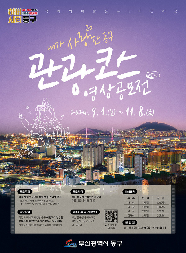 ■ 공모내용 직접 체험한 나만의 특별한 동구 여행 코스 - 축제·행사 체험, 숨어있는 비경·명소, 추억과 이야기, 관광지와 로컬 푸드 맛집 등 관 광 지 : 동구 문화플랫폼(키크니 전시중 ~9/22), 초량이바구길(구.백제병원 등), 범일 이중섭거리, 168계단, 명란브랜드연구소, 이바구공작소, 유치환의 우체통, 초량 차이나타운, 만화체험관, 만화카페, 부산포개항문화관, 부산진성, 정공단, 부산진일신여학교, 책마루전망대(동구 도서관) 등 축제 : 차이나타운 문화축제(10월), 하늘아래 첫 시장 성북×웹툰축제(9월), 북항 종이비행기 대회 등 자연경관 : 산복도로, 북항(친수공원), 구봉산 치유숲길 등 여행테마(예시) : 외국인 친구를 위한 로컬 맛집 코스, 원포인트 여행 코스, 나만의 명소 여행 코스, 반려동물과 함께하는 힐링 코스 등 자유롭게 설정 가능 * 예시에 나온 장소 외에도 부산 동구 소재 식·음료점을 포함하여 자유롭게 코스 구성 가능 ■ 참가자격 부산 동구에 관심있는 누구나(개인 또는 팀4명 이내) ■ 출품수 - 1인(팀)당 1개의 응모작 접수 가능 ■ 참가방법 직접 기획하고 체험한 동구 여행코스 영상을 유튜브에 업로드* 후 제출서류【서식1~3】를 이메일( ok1527@korea.kr )로 제출 └ *영상(8분 내외)과 요약본 쇼츠(1분 내외)를 모두 업로드 할 것 └ 유튜브 영상 ‘더보기’란에 코스 타임스탬프(타임라인) 기재 └ 신청서 파일의 제목은‘[성함or팀명] 공모전 참가 신청’으로 할 것 ■ 작품규격 유튜브 영상(8분 내외)과 요약본 쇼츠(1분 내외)를 게시할 것 ■ 시상내역 대상 1점 : 200만원 금상 1점 : 100만원 은상 2점 : 각 70만원 장려상 3점 : 각 20만원 ■ 결과발표 2024. 12월 중 예정 |