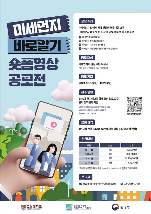 ■ 공모내용 - 미세먼지 발생 현황과 건강영향에 대한 교육 - 미세먼지 대응 행동, 저감 정책 및 정보 수집 경로 홍보 1) 내 주변 배출원 알아보기 2) 미세먼지 취약계층 알아보기 3) 미세먼지 대응 행동 알아보기 4) 미세먼지 계절관리제 및 에어코리아 알아보기 ■ 참가자격 미세먼지 관심 있는 누구나 ■ 참가방법 - SNS에 해시태그와 함께 영상 업로드 후 온라인 지원서 제출 #건강영향특성화미세먼지연구관리센터, #미세먼지바로알기숏폼영상공모전, @health_pm_center ■ 작품규격 1분 이내 숏폼(Short-form) 세로 영상 (HD급 화질 권장) ■ 시상내역 대상 1점 : 50만원 최우수상 1점 : 30만원 우수상 2점 : 각 20만원 장려상 3점 : 각 10만원 ■ 결과발표 11월 4일 |