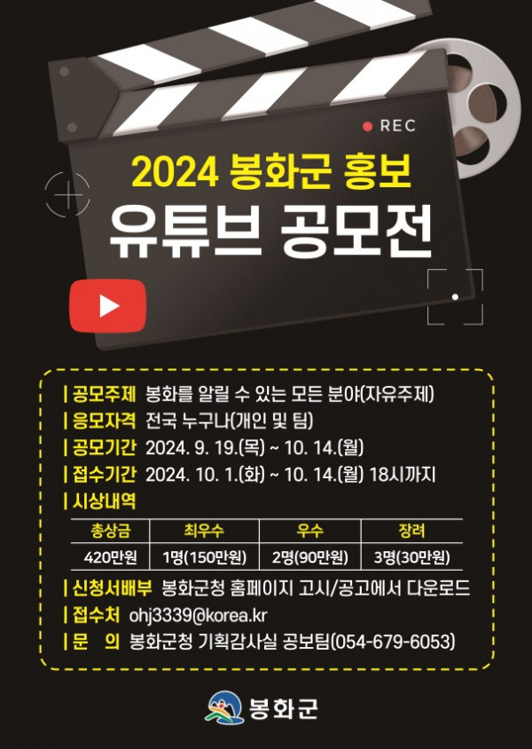 ■ 공모내용 봉화군을 알릴 수 있는 모든 분야(자유주제) - 관광, 명소, 먹방, 추억, 맛집, 일상, 체험 등 ■ 참가자격 제한 없음 개인 또는 3인 이하 팀 ■ 출품수 1인(1팀)당 2편까지 출품할 수 있으나, 중복수상 불가 ■ 참가방법 - 제출방법 : 이메일( ohj3339@korea.kr ) 제출 - 제출서류 : 작품파일, 참가신청서, 동의서, 서약서 각 1부 ※ 참가신청서, 동의서, 서약서는 봉화군 홈페이지 고시/공고에서 다운로드 - 파 일 명 : 이름(팀명)_작품명 ■ 작품규격 - 분량 : 40 ~ 60초 내외 - 해상도 : FHD(1920×1080Pixel)이상 - 파일형식 : MP4 또는 MOV ■ 시상내역 최우수 1점 : 150만원 우수 2점 : 각 90만원 장려 3점 : 각 30만원 ■ 결과발표 2024년 10월 22일(화) 예정 (봉화군 홈페이지 공지 및 개별 통보) |