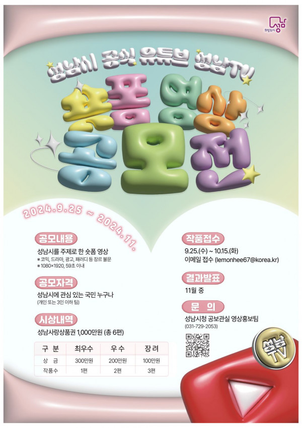 ■ 공모내용 성남시를 주제로 한 숏폼 영상 ※ 코믹, 드라마, 광고. 패러디 등 장르 불문(AI 제작 영상 불가) ■ 참가자격 개인 또는 3인 이하로 구성된 팀으로 참여 가능 ■ 출품수 1인(1팀)당 1개 작품만 응모 가능 ■ 참가방법 이메일 접수( lemonhee67@korea.kr ) 성남TV 숏폼 영상 공모전 / 작품명 / 성명(단체명)으로 메일 제출 ■ 작품규격 59초 이내, mp4, 1,080×1,920 HD급 이상(세로형) ■ 시상내역 최우수 1점 : 300만원 우수 2점 : 각 200만원 장려 3점 : 각 100만원 ■ 결과발표 2024년 11월 중 개별통보 후 성남TV에 공개 ■ 유의사항 가. 응모작은 타 공모전에 출품되지 않은 본인의 순수 창작물이어야 하며, 개인 SNS 또는 유튜브 등에 공개한 이력이 없는 작품이어야 함. 나. 응모작은 초상권 및 지식재산권(디자인, 폰트, 음원, 이미지, 서체 등모든 저작권) 등의 법적인 문제가 없는 것이어야 하며 분쟁에 따른 모든 민‧형사상의 법적 책임은 응모자에게 있음. (분쟁 등 문제 발생시 입상 이후라도 수상 취소 및 상금 환수, 법적 조치) 다. 응모작(입선작 포함)은 성남시가 이를 홍보 목적으로 활용, 재가공, 배포하는 것에 동의한 것으로 간주함. 라. 심사점수 및 내용은 공개하지 않으며, 심사결과에 이의를 제기할 수 없음. 마. 응모작품이 일정 수준에 미치지 못할 경우 시상작 수 및 상금이 조정되거나 수상작이 없을 수 있음. 바. 공고내용의 해석에 대한 사항은 성남시의 판단에 따르며, 사정에 따라 일정 및 내용 등은 변경될 수 있음. 사. 제출된 서류 및 작품 등은 반환하지 않으며, 시상금 수령에 따른 제세공과금이 발생할 경우 입상자 본인 부담임. 아. 기타 정하지 않은 사항 발생 시 성남시의 결정에 따름. |