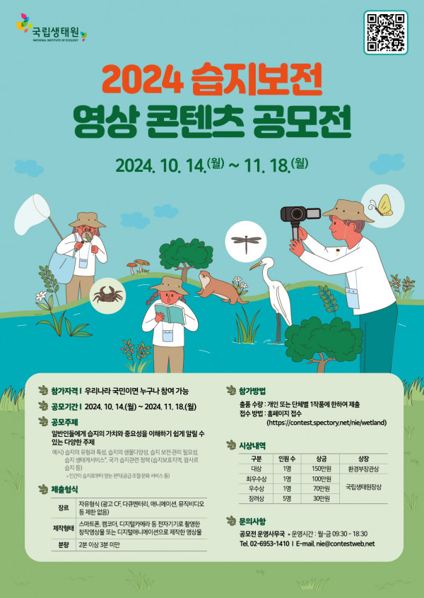 ■ 공모내용 일반인들에게 습지의 가치와 중요성을 이해하기 쉽게 알릴 수 있는 다양한 주제 예시) 습지의 유형과 특성, 습지의 생물다양성, 습지 보전·관리·필요성, 습지 생태계서비스*, 국가 습지관련 정책(습지보호지역, 람사르 습지 등) * 인간이 습지로부터 얻는 편익(공급·조절·문화·서비스등) ■ 참가자격 우리나라 국민이면 누구나 참여 가능 ■ 출품수 개인 또는 단체별 1작품에 한하여 제출 ■ 참가방법 홈페이지 접수 ( https://contest.spectory.net/nie/wetland ) ■ 작품규격 - 장르 : 자유형식(광고 CF, 다큐멘터리, 애니메이션, 뮤직비디오 등 제합 없음) - 제작형태 : 스마트폰, 캠코더, 디지털카메라 등 전자기기로 촬영한 창작영상물 또는 디지털애니메이션으로 제작한 영상물 - 분량 : 2분 이상 3분 미만 - 규격 : AVI, MP4, WMV, MPEG등 동영상 확장자 / 해상도 1,920x1,080 (권장) / 업로드 동영상 용량 500MB 이내 ■ 시상내역 - 대상(1명) l 환경부장관상 l 상금 150만원 - 최우수상(1명) l 국립생태원장상 l 상금 100만원 - 우수상(1명) l 국립생태원장상 l 상금 70만원 - 장려상(5명) l 국립생태원장상 l 상금 30만원 ※ 상금은 원천징수세액(수상자 부담)공제 후 지급 ■ 결과발표 2024년 11월 예정 |