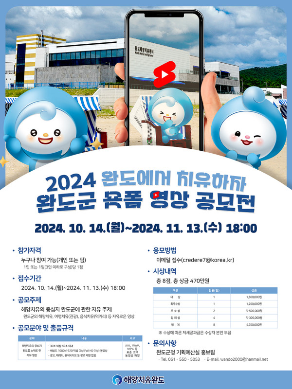 ■ 공모내용 완도군의 해양치유, 관광, 먹거리 등을 주제로 한 숏폼 영상 ※ 드라마, 광고, 패러디, 인터넷 밈 등 장르 불문(AI 제작 영상 불가) ■ 참가자격 완도군에 관심 있는 대한민국 국민 누구나 ■ 출품수 1인(팀)당 1개 작품만 응모 가능 ■ 참가방법 이메일 접수( credere7@korea.kr ) ※ 완도군 유튜브 숏폼 영상 공모전 / 작품명 / 성명(단체명)으로 메일 제출 제출서류 : 작품 영상(클린본, 편집본), 참가신청서, 서약서, 개인정보 처리 수집·이용 동의서, 초상권자 사용 동의서(서식4) - 해당 경우에 한함 ■ 작품규격 작품분량 : 59초 이내 파일형식 : AVI, MPEG, WMV, MP4 등 SNS 업로드 가능 파일 형태 해상도 : 1080 x 1920 HD급 이상(세로형) ■ 시상내역 대상 1점 : 150만원 최우수상 1점 : 100만원 우수상 2점 : 각 50만원 장려 4점 : 각 30만원 ■ 결과발표 2024년 11월 29일(금) ■ 유의사항 - 응모작은 타 공모전에 출품되지 않은 본인의 순수 창작물이어야 하며, 개인 SNS 또는 유튜브 등에 공개한 이력이 없는 작품이어야 함 - 응모작은 공모 취지에 적합하지 않은 광고성, 상업성 영상 (개인 사업체, 상가 등)은 심사 대상에서 제외됨 - 응모작은 초상권 및 지식재산권(디자인, 폰트, 음원, 이미지, 서체 등 모든 저작권) 등의 법적인 문제가 없는 것이어야 하며 분쟁에 따른 모든 민·형사상의 법적 책임은 응모자에게 있음(분쟁 등 문제 발생 시 입상 이후라도 수상 취소 및 상금 환수, 법적 조치) - 드론 촬영 분은 사전 촬영허가를 얻어야 하며, 제반 문제는 촬영자가 책임을 짐 - 응모작(입선작 포함)은 완도군이 홍보 목적으로 활용, 재가공, 배포하는 것에 동의한 것으로 간주함 - 심사점수 및 내용은 공개하지 않으며, 심사결과에 이의를 제기할 수 없음 - 응모작품이 일정 수준에 미치지 못할 경우 시상작 수 및 상금이 조정되거나 수상작이 없을 수 있음 - 출품작품은 일체 반환하지 않으며, 최종입상작에 한해서만 활용함 - 출품작들 중 당선되지 않은 출품작은 공모전 심사 종료일부터 3개월 이내 모두 폐기함 - 공고내용의 해석에 대한 사항은 완도군의 판단에 따르며, 사정에 따라 일정 및 내용 등은 변경될 수 있음 - 제출된 서류 및 작품 등은 반환하지 않으며, 시상금 수령에 따른 제세공과금이 발생할 경우 입상자 본인 부담임 - 기타 정하지 않은 사항 발생 시 완도군의 결정에 따름 |