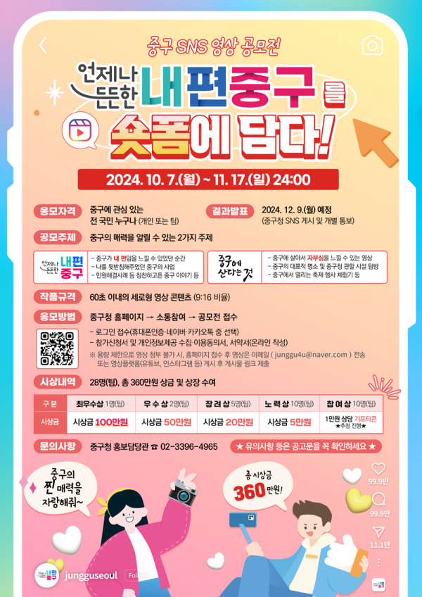 ■ 공모내용 중구의 매력을 알릴 수 있는 2가지 주제 언제나 든든한 내편중구 - 중구가 내 편임을 느낄 수 있었던 순간 - 나를 뒷받침해주었던 중구의 사업 - 민원해결사례 등 칭찬하고픈 중구 이야기 등 중구에 산다는 것 - 중구에 살아서 자부심을 느낄 수 있는 영상 - 중구의 대표적 명소 및 중구청 관할 시설 탐방 - 중구에서 열리는 축제·행사 체험기 등 ■ 참가자격 중구에 관심 있는 전 국민 누구나 ■ 참가방법 - 로그인 접수(휴대폰인증·네이버·카카오톡 중 선택) - 참가신청서 및 개인정보제공 수집·이용동의서, 서약서(온라인 작성) ※ 용량 제한으로 영상 첨부 불가 시, 이메일( junggu4u@naver.com ) 전송 또는 영상플랫폼(유튜브, 인스타그램 등) 게시 후 게시물 링크 제출 ■ 작품규격 60초 이내의 세로형 영상 콘텐츠 - 파일형식: mp4, mov, avi 등 영상 포맷(mp4권장) - 해 상 도: 세로영상 1,080×1,920 픽셀 이상(9:16 비율) - 용 량: 300MB 이하 ※ 출품 규격에 맞지 않는 출품작은 탈락 또는 감점 처리될 수 있음 ■ 시상내역 최우수상 1점 : 100만원 우수상 2점 : 각 50만원 장려상 5점 : 각 20만원 노력상 10점 : 각 5만원 참여상 10점 : 각 1만원 상당 기프티콘 ■ 결과발표 2024.12.9(월) 예정 |