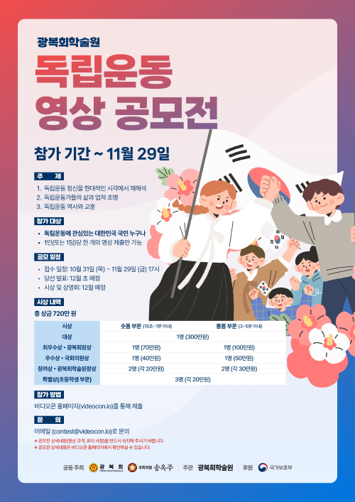 ■ 공모내용 - 독립운동 정신을 현대적인 시각에서 재해석 - 독립운동가들의 삶과 업적 조명 - 독립운동 역사와 교훈 ■ 공모부문 - 숏폼분야: 15초~1분 - 롱폼분야: 3분~5분 ■ 참가자격 독립운동에 관심있는 대한민국 국민 누구나 ■ 출품수 1인(또는 1팀)당 한 개의 영상 제출만 가능 ■ 참가방법 비디오콘 홈페이지를 통해 제출 https://www.videocon.io/sub/contest_list/contest_ing/list.html?ingcont=375 ■ 작품규격 - 영상 길이 숏폼: 15초~1분 / 롱폼: 3~5분 이내 - 영상 비율 숏폼: 9:16 / 롱폼: 16:9 - 숏폼 분야: 1080*1920(9:16), MP4권장 - 롱폼 분야: 1920*1080(16:9), MP4권장 ■ 시상내역 대상(전체 분야): 1명(팀) / 300만원 최우수상(광복회장상) - 숏폼 분야: 1명(팀) / 70만원 - 롱폼 분야: 1명(팀) / 100만원 우수상(국회의원상) - 숏폼 분야: 1명(팀) / 40만원 - 롱폼 분야: 1명(팀) / 50만원 장려상(광복회학술원장상) - 숏폼 분야: 2명(팀) / 각 20만원 - 롱폼 분야: 2명(팀) / 각 30만원 특별상(초등학생 부문): 3명(팀) / 각 20만원 ■ 결과발표 12초 예정 ■ 유의사항 - 모든 출품작의 저작권과 소유권은 창작자에게 있습니다. 제출한 영상물의 사진, 이미지, 음원, 폰트 등은 초상권, 저작권, 지적재산권, 대여권 등의 이용에 법적 문제가 없어야 하고, 분쟁 발생 시 응모자의 책임으로 규정합니다. - 수상작의 저작재산권(복제권, 공연권, 공중송신권, 전시권, 배포권, 대여권 등)은 주관사 측으로 양도됩니다.(이 규정에도 불구하고 창작자는 본 저작물을 자유롭게 이용할 수 있습니다.) - 수상작은 광복회에서 활용이 가능합니다. 수상작은 시상식 행사에 공개 상영하고, 광복회 홈페이지 및 유튜브 등에 게재하거나 비상업적 목적의 홍보, 캠페인 사업등 공익적인 목적의 자료로 활용이 가능합니다. - 출품작 제출은 광복회의 본 영상 공모전 출품요강을 준수함을 전제로 합니다.(수상후보자는 주최기관이 요구하는 추가서류를 제출해야하며, 기한 내에 제출하지 않을경우 수상이 취소될 수 있습니다.) - 동일한 주제 또는 내용으로 숏폼, 롱폼 부문 동시 제출 불가합니다. - 심사 결과에 따라 당선작이 선정되지 않을 수 있습니다. - 시상식 참여 의무 : 12월 20일(금)으로 예정되어 있는 시상 및 상영회에 수상자가 참석하지 못하는 경우 당선이 취소될 수 있습니다. |
