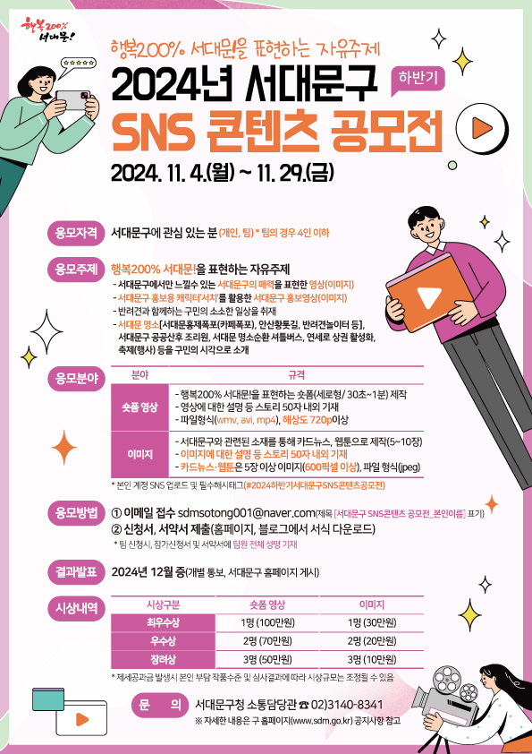 ■ 공모내용 행복200% 서대문!을 표현하는 자유주제 - 서대문구에서만 느낄수 있는 서대문구의 매력을 표현한 영상(이미지) - 서대문구 홍보용 캐릭터‘서치’를 활용한 서대문구 홍보영상(이미지) - 반려견과 함께하는 구민의 소소한 일상을 취재 - 서대문 명소[서대문홍제폭포(카페폭포), 안산황톳길, 반려견놀이터 등], 서대문구 공공산후 조리원, 서대문 명소순환 셔틀버스, 연세로 상권 활성화, 축제(행사) 등을 구민의 시각으로 소개 ■ 참가자격 서대문구에 관심있는 누구나(개인, 팀) ※팀의 경우 4인 이하 ■ 출품수 1인(1팀) 1점의 작품만 응모 가능 ■ 참가방법 응모방법 : 이메일 접수 ( yg920@sdm.go.kr ) - 제출서류 : 참가신청서, 서약서, 출품작 - 서대문구청 홈페이지에서 서식 다운로드, 기재사항 작성제출 - 이메일 제목은 [서대문구 SNS콘텐츠 공모전_본인이름]으로 표기 - 팀 신청시, 참가신청서 및 서약서에 팀원 전체 성명 기재 ※ 공모기간(2024. 11. 4. ~ 11. 29.) 제작한 콘텐츠만 가능 ※ 본인 계정 SNS 업로드 및 해시태그 (#서대문구SNS콘텐츠공모전) ■ 작품규격 - 행복200% 서대문!을 표현하는 숏폼(세로형/ 30초~1분)으로 제작 - 영상에 대한 설명 등 스토리 50자 내외 기재 - 파일형식(wmv, avi, mp4 등), 해상도 720p 이상 ■ 시상내역 최우수상 1점 : 100만원 우수상 2점 : 각 70만원 장려상 3점 : 각 50만원 ■ 결과발표 2024. 12월 중 (개별 통보, 서대문구 홈페이지 게시) ■ 유의사항 ○ 개인 또는 팀으로 응모 가능하며 팀으로 응모 시 팀 1인을 대표자로 지정하여 제출 ○ 모든 응모작은 공모기간(2024.11.4.~11.29.) 내 제작하여 본인 SNS에 게시한 순수 창작물이어야 함 ○ 작품의 전체 또는 일부가 이미 유포된 것을 포스팅하거나 공모취지에 적합하지 않은 광고성, 상업성 글은 심사대상에서 제외됨 ○ 응모작은 타 공모전 수상작, 지적재산권(음원, 영상, 사진, 이미지 폰트 등) 침해, 제3자의 초상권 및 타인의 명예 훼손, 사실과 무관한 컴퓨터그래픽 이미지 합성, 타인의 저작물 및 명의도용으로 확인된 경우에는 수상 취소 및 상금이 환수될 수 있음 ○ 영상물에는 저작권에 문제없는 음원을 사용해야 하며, 영상물의 끝에는 반드시 음원 제목과 출처를 명시해야 함(음원저작권 관련 문의는 한국음악저작권협회 문의 www.komca.or.kr) ○ 응모작과 관련한 분쟁이 발생할 경우 일체의 법적․도의적 책임은 응모자에게 있음 ○ 심사점수는 비공개로 하며, 심사결과에 대해 어떠한 이의도 제기할 수 없음 ○ 심사를 위한 파일을 제출하여야 하며 제출서류는 반환하지 않음 ○ 최종수상작은 원본 파일을 제출하며, 영상분야의 경우 클린본 별도 제출 ○ 수상작은 서대문구의 홍보자료로 활용될 수 있음(필요에 따라 수정 또는 변형하여 사용가능) |