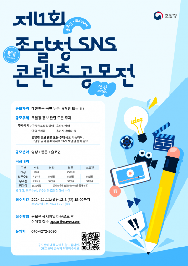 ■ 공모내용 조달청 관련 모든 주제 * 주제예시 : ① 공공조달길잡이 ② 나라장터 ③ 혁신제품 ④ 원자재비축 등 조달청 관련 어떠한 주제도 응모 가능하며, 조달청 공식 홈페이지와 SNS 채널을 통해 참고 가능 ■ 참가자격 대한민국 국민 누구나 ■ 참가방법 - 이메일 접수 : ppspr@naver.com - 제출서류 : ①응모작품 ②참가신청서 ③개인정보 수집·이용 동의서 ■ 작품규격 - 3분 이내 길이의 순수 창작 영상물 - 파일형식 avi, wmv, mp4, mpg 중 택1 - 해상도 1280*720(HD) 이상 - 광고, 애니메이션, 모션그래픽 등 형식 자유 - 수상작은 추후 원본파일 제출 ■ 시상내역 대상 1점 : 100만원 최우수상 1점 : 50만원 우수상 2점 : 각 30만원 참가상 10점 : 문화상품권 5만원권(추첨) ■ 결과발표 수상작 발표 : 2024.12.23.(월) 조달청 공식 SNS 채널 게시 및 개별통보 예정 |