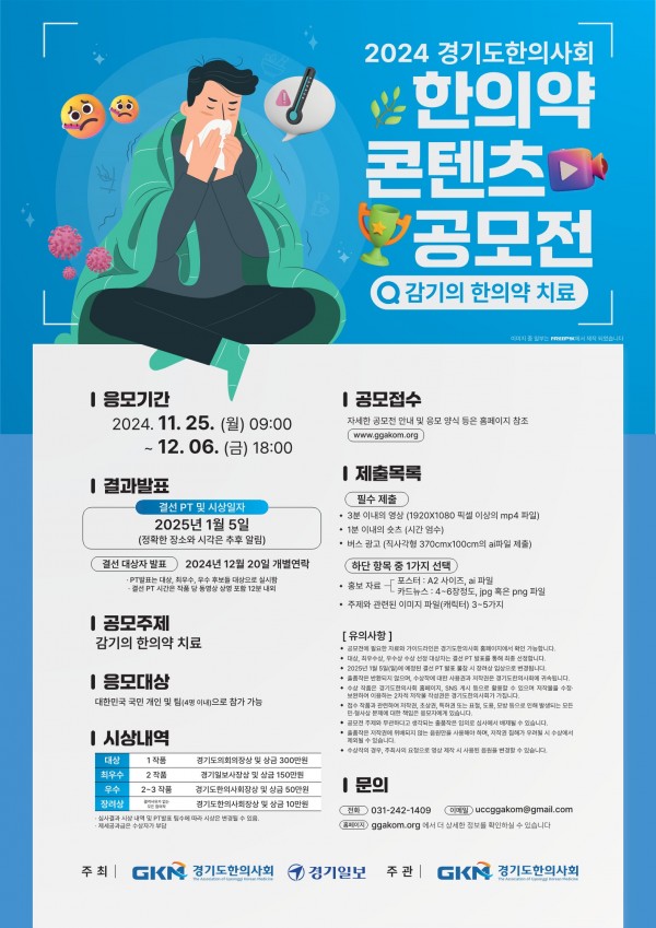 ■ 공모내용 감기의 한의약 치료 ■ 참가자격 대한민국 국민 개인 및 팀(4명이내)으로 참가 가능 ■ 참가방법 구글폼을 통한 접수 https://forms.gle/n8twvTic8wSPKKYBA ■ 작품규격 1) 3분 이내의 영상 (1920*1080 픽셀 이상의 mp4파일) 2) 1분 이내의 숏츠 (시간엄수) 3) 버스 광고 (직사각형 370cm * 100cm의 ai파일 제출) - 하단 항목 중 1가지 선택 1) 홍보자료 포스터: A2사이즈, ai파일 2) 홍보자료 카드뉴스 : 4~6장정도, jpg 혹은 png 파일 3) 주제와 관련된 이미지 파일(캐릭터) 3~5가지 ■ 시상내역 대상 1점 : 경기도의회의장상 및 상금 300만원 최우수상 2점 : 경기일보대표이사회장상 및 상금 150만원 우수상 2~3점 : 경기도한의사회장상 및 상금 50만원 장려상 : 결격사유가 없는 참여 작품 - 경기도한의사회장상 및 상금 10만원 ■ 결과발표 1차) 2024.12.20(금) 개별연락 2차) 2025.01.05.(일) 16:00 PT심사 및 결과 발표 ■ 유의사항 - 공모전에 필요한 자료와 가이드라인은 경기도한의사회 홈페이지에서 확인 가능합니다. - 대상, 최우수상, 우수상 수상 선정 대상자는 결선 PT 발표를 통해 최종 선정합니다. - 2024년1월5일(일) 16:00 예정된 결선 PT 발표 불참 시 장려상 입상으로 변경됩니다. – 출품작은 반환되지 않으며, 수상작에 대한 사용권과 저작권은 경기도한의사회에 귀속 됩니다. – 수상 작품은 경기도한의사회 홈페이지, SNS 게시 등으로 활용할 수 있으며 저작물을 수정 · 보완하여 이용하는 2차적 저작물 작성권은 경기도한의사회가 가집니다. – 접수 작품과 관련하여 저작권, 초상권, 특허권 또는 표절, 도용, 모방 등으로 인해 발생 되는 모든 민·형사상 문제에 대한 책임은 응모자에게 있습니다. – 공모전 주제와 무관하다고 생각되는 출품작은 임의로 심사에서 배제될 수 있습니다. – 출품작은 저작권에 위배되지 않는 음원만을 사용해야 하며, 저작권 침해가 우려될 시 수상에서 제외될 수 있습니다. – 수상작의 경우, 주최사의 요청으로 영상 제작 시 사용된 음원을 변경할 수 있습니다. |