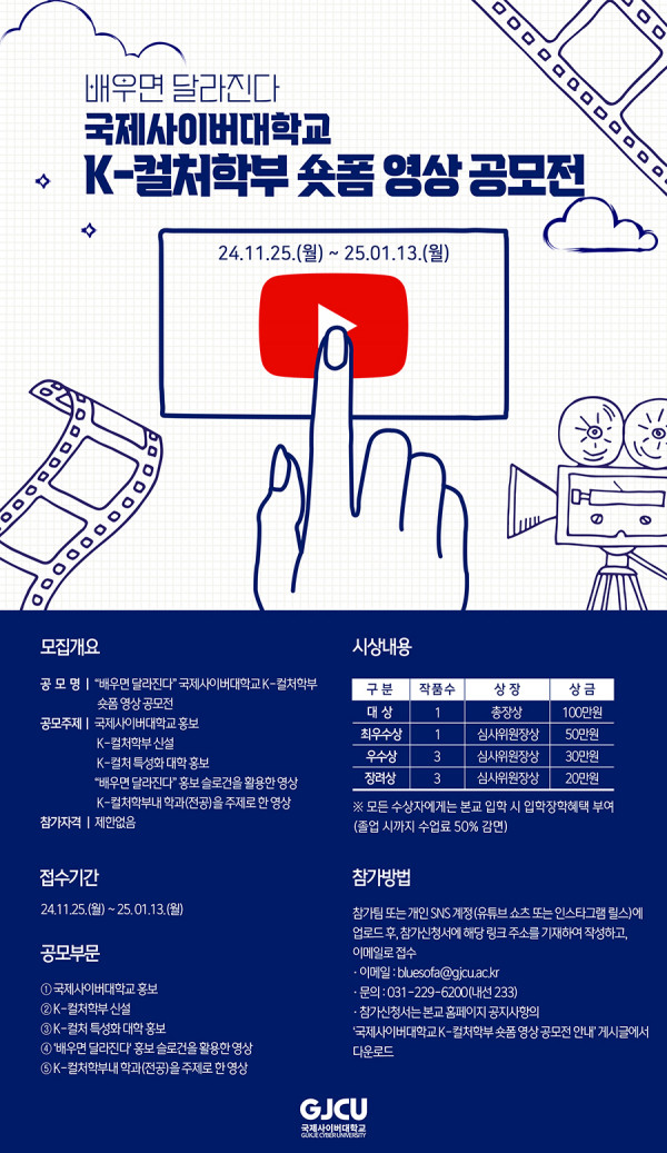 ■ 공모내용 국제사이버대학교 홍보, K-컬처학부 신설, K-컬처 특성화 대학 홍보, “배우면 달라진다” 홍보 슬로건을 활용한 영상, K-컬처학부내 학과(전공)를 주제로 한 영상 ※ K-컬처학부: K-영상크리에이터학과, K-엔터테인먼트학과, K-e스포츠학과, K-뷰티아트학과, 한국어교육전공 ■ 참가자격 제한 없음 ■ 출품수 1인(팀) 당 두 작품까지 출품 가능 ■ 참가방법 참가팀 또는 개인 SNS 계정(유튜브 쇼츠 또는 인스타그램 릴스)에 업로드 후, 참가신청서에 해당 링크 주소를 기재하여 작성하고, 이메일로 접수 bluesofa@gjcu.ac.kr - 영상제목 가이드: [2025 국제사이버대학교 K-컬처학부 숏폼 영상 공모전] “작품명” - 필수 해시태그: #국제사이버대학교 #사이버대학 #K-컬처학부 #영상크리에이터 #엔터테인먼트 #e스포츠 #K뷰티 #한국어교육 ■ 작품규격 1분 미만의 영상, 그래픽, 애니메이션 등 장르나 형식 제한은 없으나, 모든 연령대가 시청 가능하여야 함(업로드된 동영상은 9:16 세로형 숏폼(1080×1920 pixels) 형식이어야 함) ■ 시상내역 대상 1점 : 100만원 최우수상 1점 :50만원 우수상 3점 : 각 30만원 장려상 3점 : 각 20만원 ■ 결과발표 2025년 1월 말 예정 ■ 유의사항 1) 출품자가 직접 촬영 및 제작한 창작물이어야 하며, 1인(팀) 당 두 작품까지 출품 가능 2) 1분 미만의 영상, 그래픽, 애니메이션 등 장르나 형식 제한은 없으나, 모든 연령대가 시청 가능하여야 함(업로드된 동영상은 9:16 세로형 숏폼(1080×1920 pixels) 형식이어야 함) 3) 대학이라는 기관에 걸맞게 윤리적, 교육적이어야 함. 관련 문제가 있는 경우 시상에서 제외하거나 시상 후라도 취소될 수 있음 4) 응모를 위해 제출된 서류 등 일체는 반환하지 아니함 5) 출품자(팀)는 출품작이 타인의 초상권, 저작권, 상표권, 지적재산권, 소유권, 명의도용, 명예훼손 등(사진, 이미지, 합성, 음원, 영상, 폰트, 소스 등)을 침해하지 않도록 주의 의무를 다해야 하며, 이에 대한 분쟁이 발생할 경우 모든 책임은 출품자(팀)에게 있음 6) 상기 내용을 포함하여 공모전 내용 및 취지를 위반하거나 각종 분쟁이 발생 시 수상 이후라도 이를 취소하고 상금을 환수할 수 있음 7) 수상작에 대한 저작권은 수상자(팀)에게 있으며, 국제사이버대학교는 수상작에 한하여 대학 관련 홈페이지, SNS, 기타 영상매체 등을 통해 홍보에 활용할 수 있음 - 대학 홍보의 범위 안에서 수상작에 대한 저작물 이용은 수상과 동시에 허락한 것으로 보고, 이용료는 입상에 따른 시상금으로 대체함 - 국제사이버대학교는 수상작을 대학 홍보에 활용함에 있어 효율성을 위해 작품의 본질을 훼손하지 않는 범위내에서 일부 편집 또는 수상작 합본 제작, 디지털 소스 수정 등을 진행할 수 있음 - 저작물 이용과 관련하여 수상자(팀)의 저작인격권을 최대한 존중할 것이나, 추후 대학 홍보 활용 과정에서 이의가 있을 경우 언제든지 제기가 가능함(학생처 031-229-6231~5) 8) 단체(팀)로 출품한 수상작은 대표 명의로 시상하며, 상금도 대표자에게 지급함 9) 심사내용은 공개하지 않으며, 심사결과에 대한 어떠한 이의도 제기할 수 없음 |