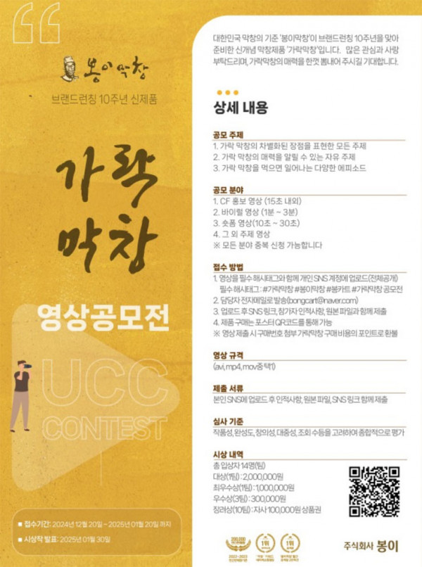 ■ 공모내용 1. 가락막창의 차별화 된 장점을 표현한 모든 주제 2. 가락막창의 매력을 알릴 수 있는 자유 주제 3. 가락막창을 먹으면 일어나는 다양한 에피소드 ■ 참가자격 제한없음 ■ 출품수 복수의 작품응모는 가능하나, 중복수상은 불가 ■ 참가방법 1. 영상을 필수 해시태그와 함께 개인 SNS 계정에 업로드(전체공개) 필수 해시태그 : #가락막창 #봉이막창 #봉카트 #가락막창공모전 2. 담당자 전자메일로 발송 ( bongcart@naver.com ) 3. 업로드 후 참가자 인적사항, 원본 파일과 함께 제출 4. 제품 구매는 포스터 QR코드를 통해 가능 ※ 영상 제출 시 구매번호 첨부 가락막창 구매비용의 포인트로 환불 ■ 작품규격 avi, mp4, mov 등 1. CF 홍보 영상(15초 내외) 2. 바이럴 영상 (1분~3분) 3. 숏폼 영상 ( 10초~30초) 4. 그 외 주제 영상 ※ 모든 분야 중복 신청 가능합니다 ■ 시상내역 대상 1점 : 200만원 최우수상 1점 : 100만원 우수상 3점 : 각 30만원 장려상 10점 : 각 10만원 상당 상품권 ■ 결과발표 2025년 1월 30일 |
