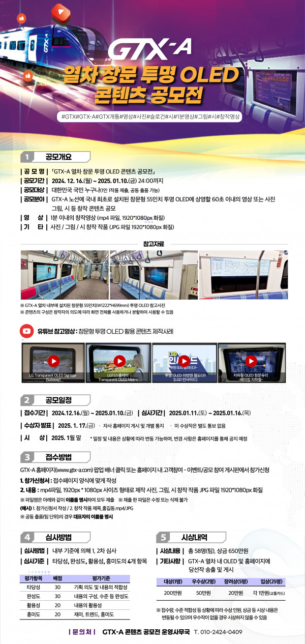 ■ 공모내용 GTX-A노선에 국내 최초로 설치된 창문형 55인치 투명 OLED에 상영할 60초 이내의 영상 또는 사진 그림, 시 등 창작 콘텐츠 공모 ■ 참가자격 대한민국 국민 누구나 ■ 출품수 1인 1작품 제출, 공동 출품 가능 ■ 참가방법 공모전 홈페이지를 통한 직접 접수 ■ 작품규격 영상 1분 이내의 창작영상 (mp4 파일, 1920*1080px화질) ■ 시상내역 대상 1점 : 200만원 우수상 2점 : 각 50만원 장려상 5점 : 각 20만원 입상 25점 : 각 1만원(교통카드) ※ 영상, 사진, 그림, 시등 통합 시상입니다. ■ 결과발표 2025.1.17 |