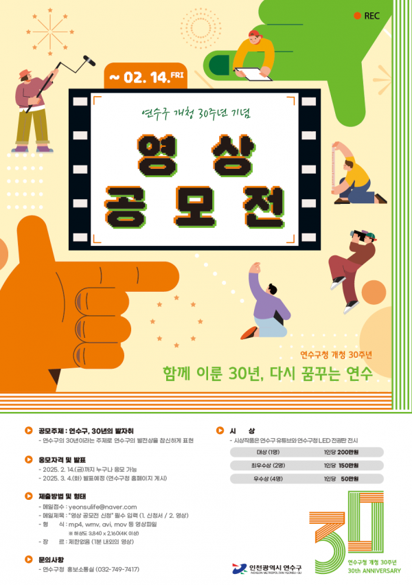 ■ 공모내용 연수구, 30년의 발자취 - 연수구의 30년이라는 주제로 연수구의 발전상을 참신하게 표현 ■ 참가자격 누구나 ■ 참가방법 이메일 접수 : yeonsulife@naver.com * 메일제목에 '영상 공모전 신청' 필수 입력, 1.신청서 2. 영상 제출 ■ 작품규격 - 형식 : mp4, wmv, avi, mov 등 영상파일 - 해상도 3,840 * 2,160 (4K 이상) - 분량 : 1분 내외의 영상 - 장르 : 제한없음 ■ 시상내역 대상 1점 : 200만원 최우수상 2점 : 각 150만원 우수상 4점 : 각 50만원 ■ 결과발표 2025.3.4.(화) 발표예정