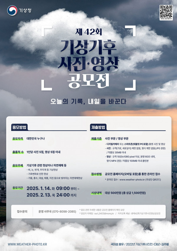 ■ 공모내용 기상기후 관련 현상이나 자연재해 등 - 비, 눈, 번개, 무지개 등 기상현상, 기후변화로 인한 현상 등 - 가뭄, 홍수, 대설, 태풍, 지진 등으로 빚어지는 자연재해 현상 등 ■ 참가자격 대한민국 국민 누구나 ■ 출품수 영상 5점 이내 단, 입상은 1인 1작품 시상(최고 상격 및 상금에 해당) ■ 참가방법 공모전 홈페이지를 통한 직접 접수 ■ 작품규격 - 규격 1920*1080 pixel 이상, 분량 60초 내외, 형식 MP4 권장 - 작품당 100MB 이내 클린본 - 자막 및 영상 효과 추가 등의 편집 없이 순수한 촬영본만 대상으로 함 ※ 촬영일은 최근 3년 이내(2022.1.1. 이후) 촬영본에 한정 ■ 시상내역 특별상 3점 : 각 50만원 ■ 결과발표 3.12.(수) 예정, 공지사항 및 개별 안내 ■ 유의사항 1. 제출 규정 및 출품 규격에 맞지 않는 작품은 심사 대상에서 제외함 2. 적격자가 없을 경우 상금, 상격 및 수상인원 등은 변동될 수 있음 3. 아래에 해당할 경우, 당선 후라도 무효 처리 및 상금을 회수할 수 있음 - 사진 트리밍 및 약간의 색상보정 외에 합성/변형된 사진으로 사실을 왜곡한 작품 및 표절, 모방작, 타인의 명의로 대리 출품한 작품, 타 공모전 입상작, 메타정보 조작된 작품 등은 심사대상에서 제외되며, 수상 후 밝혀질 경우 입상 취소 및 상장과 상금 반환을 원칙으로 함. 4. 출품된 작품의 저작권은 출품자(응모자)에게 있으며, 주최기관은 수상작에 한해 비상업적 목적으로 독점적 무기한 복제・배포할 수 있음 5. 주최기관의 필요시 저작자와 별도의 협의를 거쳐 출품작에 대한 저작재산권을 양수하거나 이용 허락받을 수 있음 6. 공모에 관한 모든 변경 및 추가 사항은 공모전 접수사이트 등에 공지함 7. 모든 출품작은 출품할 때나 주최기관이 수상작으로 선정하여 널리 사용할 때 법적 문제가 없어야 함 8. 모든 출품작 제작 과정에서 일어나는 안전사고 및 저작권, 초상권, 명예훼손 등 출품작에 대한 분쟁 발생 시 모든 책임은 출품자(저작자)에게 있음 9. 2차 심사 대상으로 선정된 작품의 출품자는 반드시 주최사 요구에 따라 원본 파일을 제출해야 하며, 제출하지 않을 시 심사 대상에서 제외됨 ※ 수상 대상작이 아닐 경우, 심사 종료 후 응모 내역 일체를 즉시 파기함 10. 수상작은 기상청 누리집 및 유튜브, SNS, 전시회 등 온오프라인 홍보에 이용될 수 있음 11. 응모자는 응모와 동시에 추후 입상 시 수상작을 활용한 2차 저작물 이용을 허락한 것으로 간주하고, 수상작의 저작재산권의 이용료는 입상에 따른 시상금으로 대체될 수 있으며 별도 계약을 체결함 12. 수상후보작의 경우 수상확인서, 저작권 자유이용허락 동의서, 초상권 사용 동의서 및 「항공촬영 지침서(국방부)」, 「군 관할공역 내 민간 초경량비행장치 비행승인 안내서(국방부)」에 따른 비행승인신청서, 항공촬영신청서, 보안성조치 서류 등 해당 부문 관련 증빙서류를 요청 시 제출해야 함 |