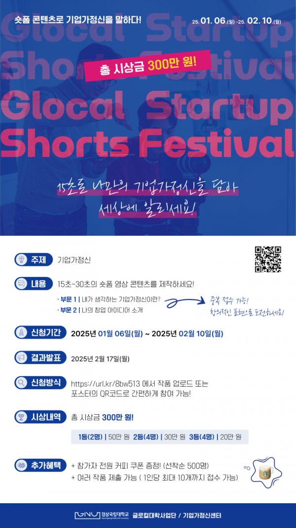 ■ 공모내용 기업가정신 ■ 공모부문 - 부문 1 : 내가 생각하는 기업가정신이란? - 부문 2 : 나의 창업 아이디어 소개 ■ 출품수 여러 작품 제출 가능 (1인당 최대 10개까지 접수 가능) ■ 참가방법 https://url.kr/8bw513 에서 작품 업로드 또는 포스터의 QR코드로 간편하게 참여 가능 ■ 작품규격 15초~30초의 숏폼 영상 콘텐츠 ■ 시상내역 1등 2명 : 각 50만원 2등 4명 : 각 30만원 3등 4명 : 각 20만원 ※ 참가자 전원 커피 쿠폰 증정 (선착순 500명) ■ 결과발표 2025년 2월 17일 |