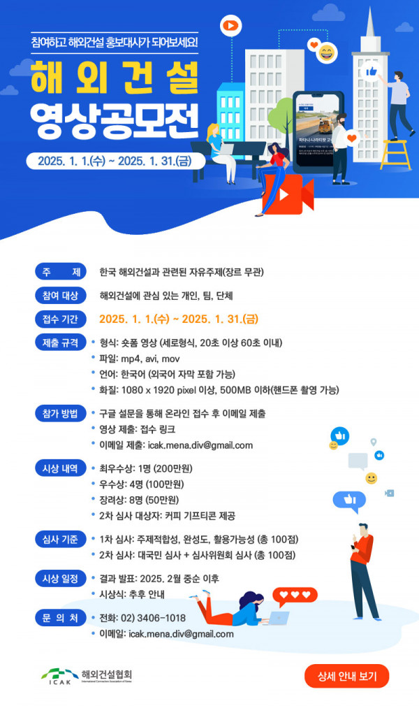 ■ 공모내용 “한국의 해외건설”과 관련된 자유로운 주제로, 우리 해외건설의 활동을 쉽고 친근하게 표현 - 스마트 건설, 미래를 짓다: 4차 산업혁명 시대, 건설 현장에 도입된 스마트 기술과 미래 건설의 모습을 제시지역 사회와의 상생: 해외 건설 프로젝트를 통해 지역 사회에 기여하고 상생하는 모습 - 해외 건설 현장의 사람들: 다양한 국적의 사람들이 함께 일하며 만들어가는 해외 건설 현장의 이야기 - VR로 체험하는 해외 건설 현장: 가상현실 기술을 활용하여 해외 건설 현장을 생생하게 체험 - 만화로 보는 해외 건설 이야기: 해외 건설 현장의 에피소드를 만화 형식으로 재미있게 표현 - 시간 여행을 떠나는 해외 건설 이야기 : 과거부터 현재까지 해외 건설 현장의 변화를 시간 순서대로 보여주는 영상 ■ 참가자격 해외건설에 관심있는 전 국민(개인, 팀, 또는 단체) ※ 단체는 해당 조직명으로만 참여가능(같은 기업에서 복수의 부서가 참여할 경우 팀으로 함) ■ 출품수 아래 1인당 최대 3작품까지 출품가능(시상은 한작품에 한해 시행) ■ 참가방법 구글 설문을 통해 온라인 접수 후 이메일 제출 - 구글폼 : https://forms.gle/CM1ekjeXMQtsS55L9 - 이메일 : icak.mena.div@gmail.com ■ 작품규격 - 유 형 : 장르 무관(V-log, 패러디, 다큐, 코미디, 광고, 애니메이션 등) - 파 일 : mp4, avi, mov - 언 어 : 한국어(영어 등 외국어의 경우 한국어 자막 포함) - 분 량 : 20초 이상 60초 이내 - 화 질 : 1080 X 1920 pixel 이상(핸드폰 촬영 가능) - 형 식 : 세로형식 숏폼영상으로 500MB 이하 (9:16 비율) ※ 인스타그램 및 유튜브에 게시가 가능해야 함 ※ 영상 파일의 경우 별도의 애플리케이션 설치 없이 열 수 있는 파일이어야 함 ■ 시상내역 최우수상 1점 : 200만원 우수상 4점 : 각 100만원 장려상 8점 : 각 50만원 ■ 결과발표 2월 중순 이후 |