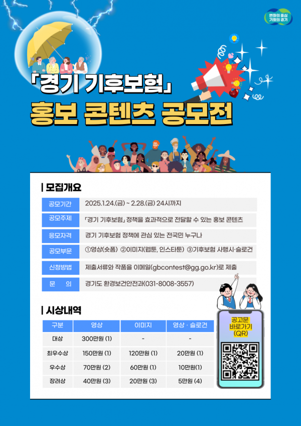 ■ 공모내용 경기 기후보험」 정책을 효과적으로 전달할 수 있는 홍보 콘텐츠 < 경기 기후보험 > - 목표 : 기후보험을 통한 도민 기후격차(climate divide) 해소와 건강피해 구제 - 내용 : 2025년 전국 최초로 기후 관련 건강피해 보장 보험(정액․정책보험) - 경기 기후보험 보장 내역 . 경기도민 : 온열질환 진단비, 한랭질환 진단비, 감염병 진단비, 기후재해 사고 위로금 . 기후 취약계층(특약) : 온열질환 입원, 한랭질환 입원, 기후재해 사고 위로금, 기후특보 발생 시 의료기관 교통비, 기후재해 긴급 이후송 지원(기후특보 시), 기후재해 정신적피해(트라우마) 지원금 ■ 참가자격 경기 기후보험 정책에 관심 있는 전국민 누구나 ■ 출품수 출품작 수 제한은 없으나 중복 수상 불가 ■ 참가방법 제출서류와 함께 이메일( gbcontest@gg.go.kr ) 제출 ■ 작품규격 - 광고, 드라마, 애니메이션, 뮤직비디오,브이로그 등 형식 자유 - 길이 : 30 ~ 90초 숏폼 - mp4, mov 중 택1 - 1080 × 1920 pixel 이상 - 파일당 700MB 이내, 9:16 비율 ■ 시상내역 대상 1점 : 300만원 최우수상 1점 : 150만원 우수 2점 : 각 70만원 장려 3점 : 각 40만원 ■ 결과발표 2005.04.07 |