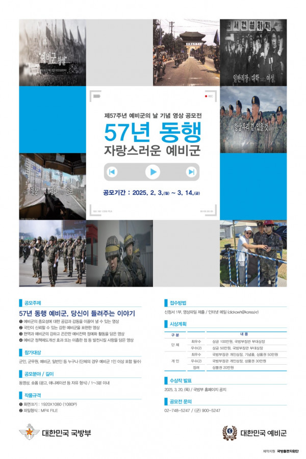 ■ 공모내용 57년 동행 예비군, 당신이 들려주는 이야기 - 예비군의 중요성에 대한 공감과 감동을 이끌어 낼 수 있는 영상 - 국민이 신뢰할 수 있는 강한 예비군을 표현한 영상 - 현역과 예비군의 강하고 끈끈한 예비전력 정예화 활동을 담은 영상 - 예비전력 정책제도개선 효과 또는 미흡한 점 등 발전시킬 사항을 담은 영상 ■ 참가자격 군인, 군무원, 예비군, 일반인 등 누구나(단체의 경우 예비군 1인 이상 포함 필수) ■ 참가방법 이메일 접수 : clickowh@korea.kr ■ 작품규격 동영상 및 숏폼(광고, 애니메이션 등 자유 형식) / 1~3분 이내 ■ 시상내역 최우수 1점 : 50만원 상품권 우수 2점 : 각 30만원 상품권 장려 : 20만원 상품권 ■ 결과발표 2025.3.20 |