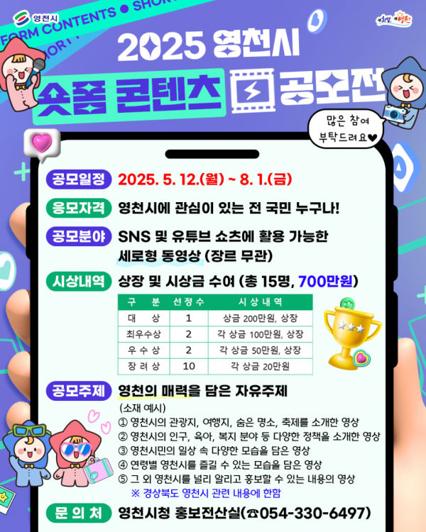 ■ 공모내용 영천의 매력을 담은 자유주제 <소재 예시> ① 영천시의 관광지, 여행지, 숨은 명소, 축제를 소개한 영상 ② 영천시의 인구, 육아, 복지 분야 등 다양한 정책을 소개한 영상 ③ 영천시민의 일상 속 다양한 모습을 담은 영상 ④ 연령별 영천시를 즐길 수 있는 모습을 담은 영상 ■ 참가자격 영천시에 관심이 있는 전 국민 누구나 ■ 출품수 1인 2개 작품 이내 제출 가능(중복 수상 불가) ■ 참가방법 이메일 접수( yeongcheonsi@naver.com ) - 제출서류 : 참가신청서 1부, 개인정보의 수집·이용 동의서 1부, 참가서약서 1부, 응모작품 원본 - 영천시 블로그와 홈페이지에서 서식 다운로드, 기재사항 작성 후 제출 - 이메일 제목은 [2025 영천시 숏폼 콘텐츠 공모전_본인이름]으로 표기 후 신청서와 응모작품을 zip파일로 압축하여 제출 - 제출서류를 반드시 모두 작성하여 2025. 8. 1.(금)까지 제출 - 다수 작품 신청 시 각각의 참가신청서 작성 ■ 작품규격 - 재생시간: 30초 이상 1분 이내 영상 - 파일유형: MP4, AVI 등 - 해 상 도: 세로형 Full HD 1080*1920px(세로가 긴 숏폼 형식) - 디자인, 음원, 폰트 등 저작권 등록이 되어있지 않고 타 공모전에 출품 수상한 내역이 없는 순수 창작물로 공모기간 전을 포함한 공모기간 내 개인 계정에 업로드 되지 않은 작품 - 규격에 맞지 않은 출품작은 탈락 또는 감점 처리 - AI제작 영상 제출 불가 - 2025. 1. 1. 이후 촬영된 작품 ■ 시상내역 대상 1점 : 200만원 최우수상 2점 : 각 100만원 우수상 2점 : 각 50만원 장려상 10점 : 각 20만원 ■ 결과발표 2025. 8월 예정(개별 통보, 블로그 및 홈페이지 게시) |